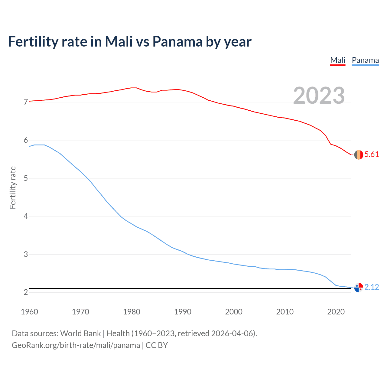 According to the latest available data on birth rates, the fertility rate in Mali was 5.61 children per woman in 2023, compared to 2.12 in Panama in 2023. The replacement level is considered to be 2.1 children per woman.