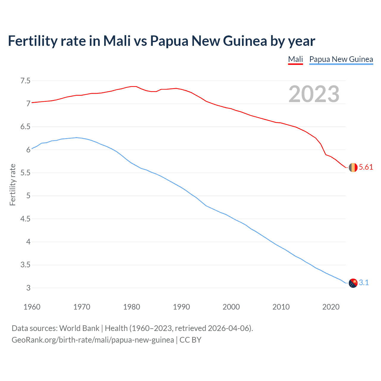 1960 vs 2023, the fertility rate has decreased by 20% in Mali and by 48.5% in Papua New Guinea — in 1960, it was 7.02 and 6.02, respectively.