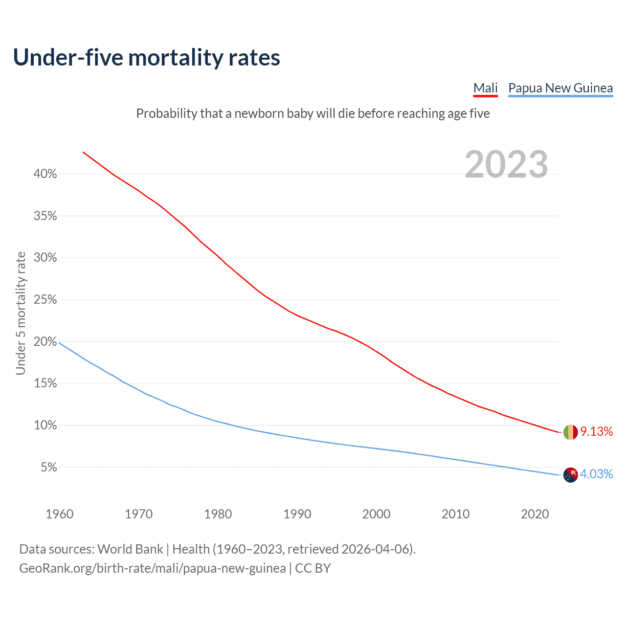 The chance that a newborn baby will die before reaching age five is 9.13% in Mali and 4.03% in Papua New Guinea. Above is a chart with historical data on under-five mortality rates.