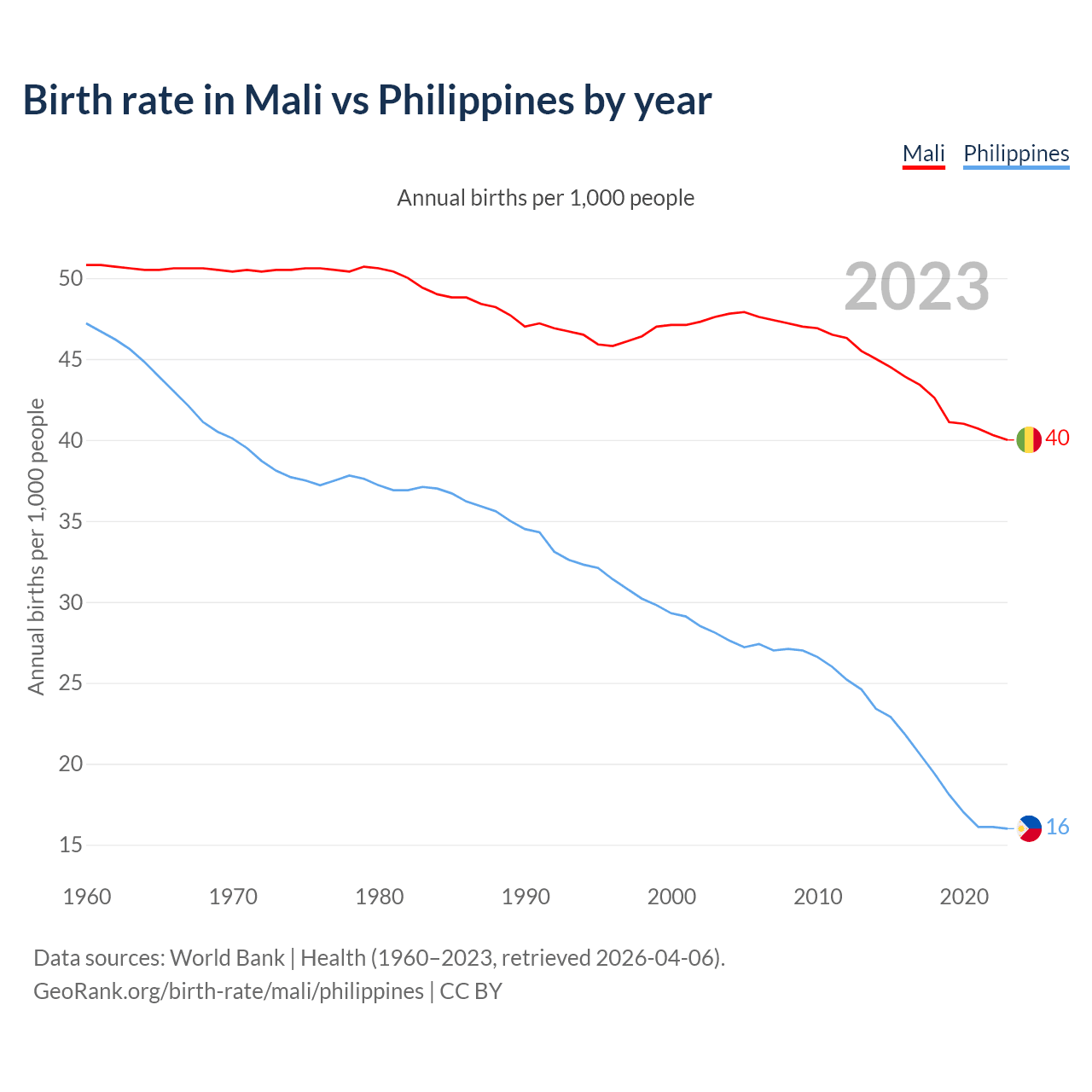 Mali has an annual birth rate of 40 births per 1,000 people, compared to 16 for the Philippines. The average number of children a woman is expected to have during her lifetime — the fertility rate, is 5.61 in Mali and 1.92 in the Philippines — 65.9% difference.
