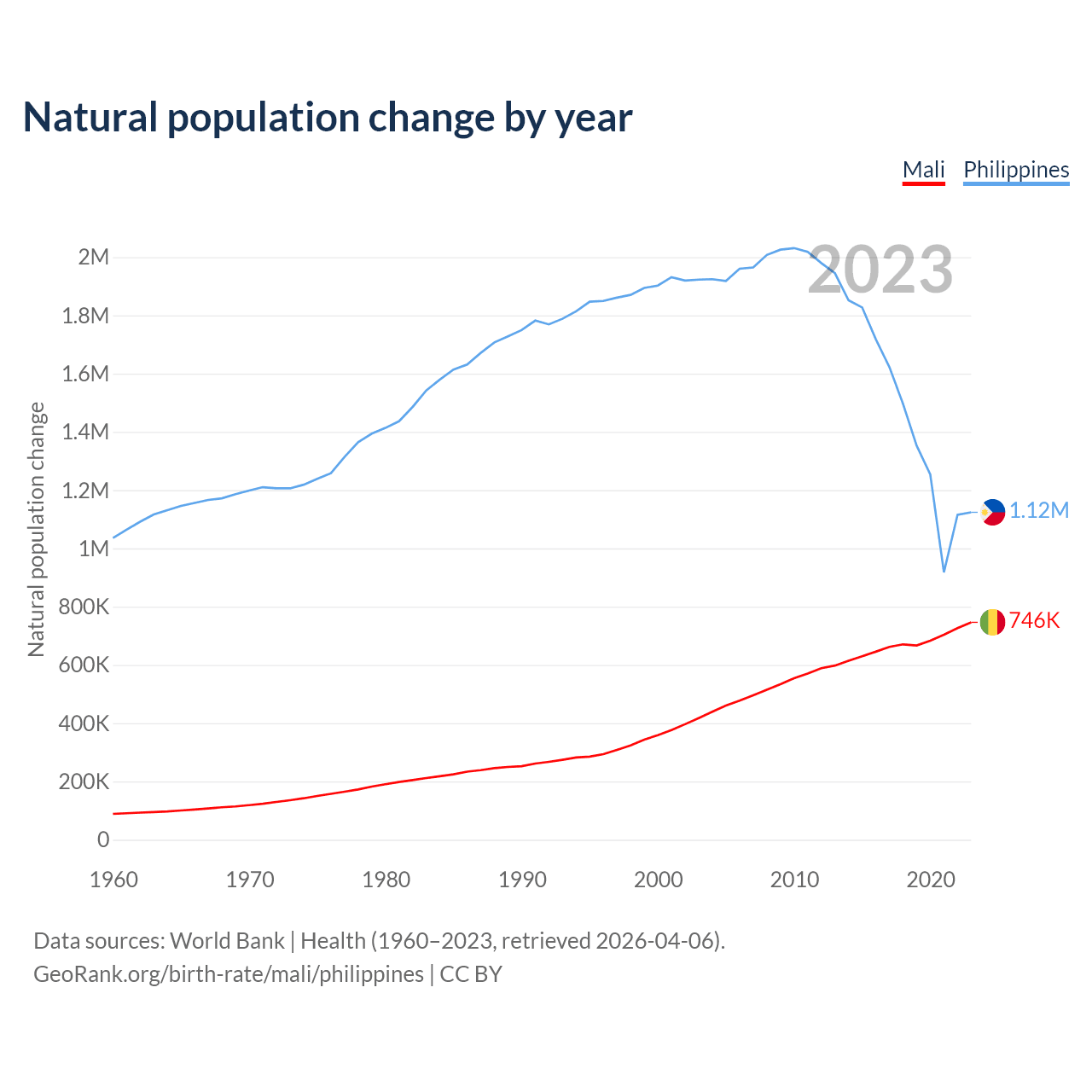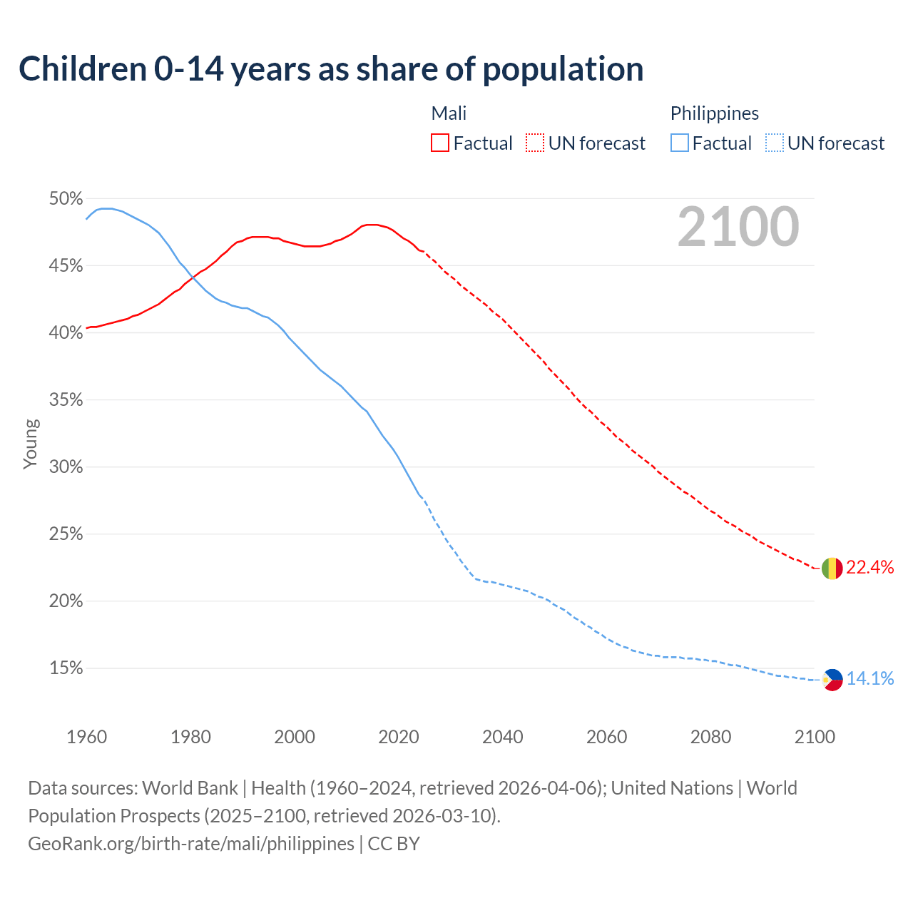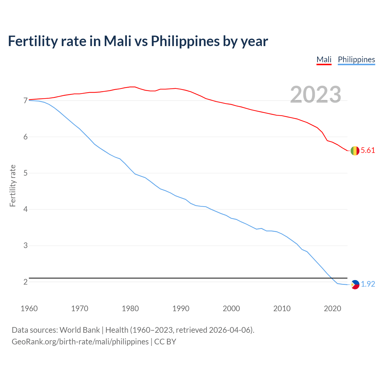 According to the latest available data on birth rates, the fertility rate in Mali was 5.61 children per woman in 2023, compared to 1.92 in the Philippines in 2023. The replacement level is considered to be 2.1 children per woman.