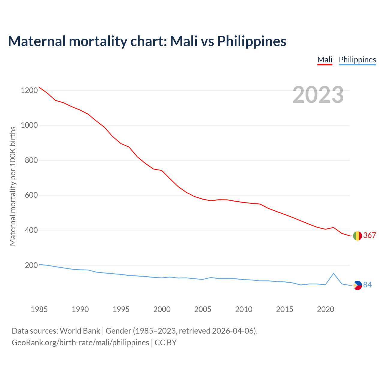The maternal mortality rate, which is the probability of dying during childbirth or within 42 days of pregnancy termination, is 367 deaths per 100,000 live births in Mali, compared to 84 deaths in the Philippines.
