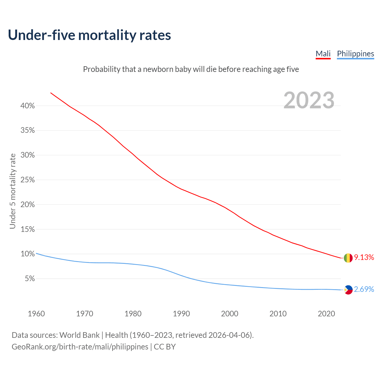The chance that a newborn baby will die before reaching age five is 9.13% in Mali and 2.69% in the Philippines. Above is a chart with historical data on under-five mortality rates.