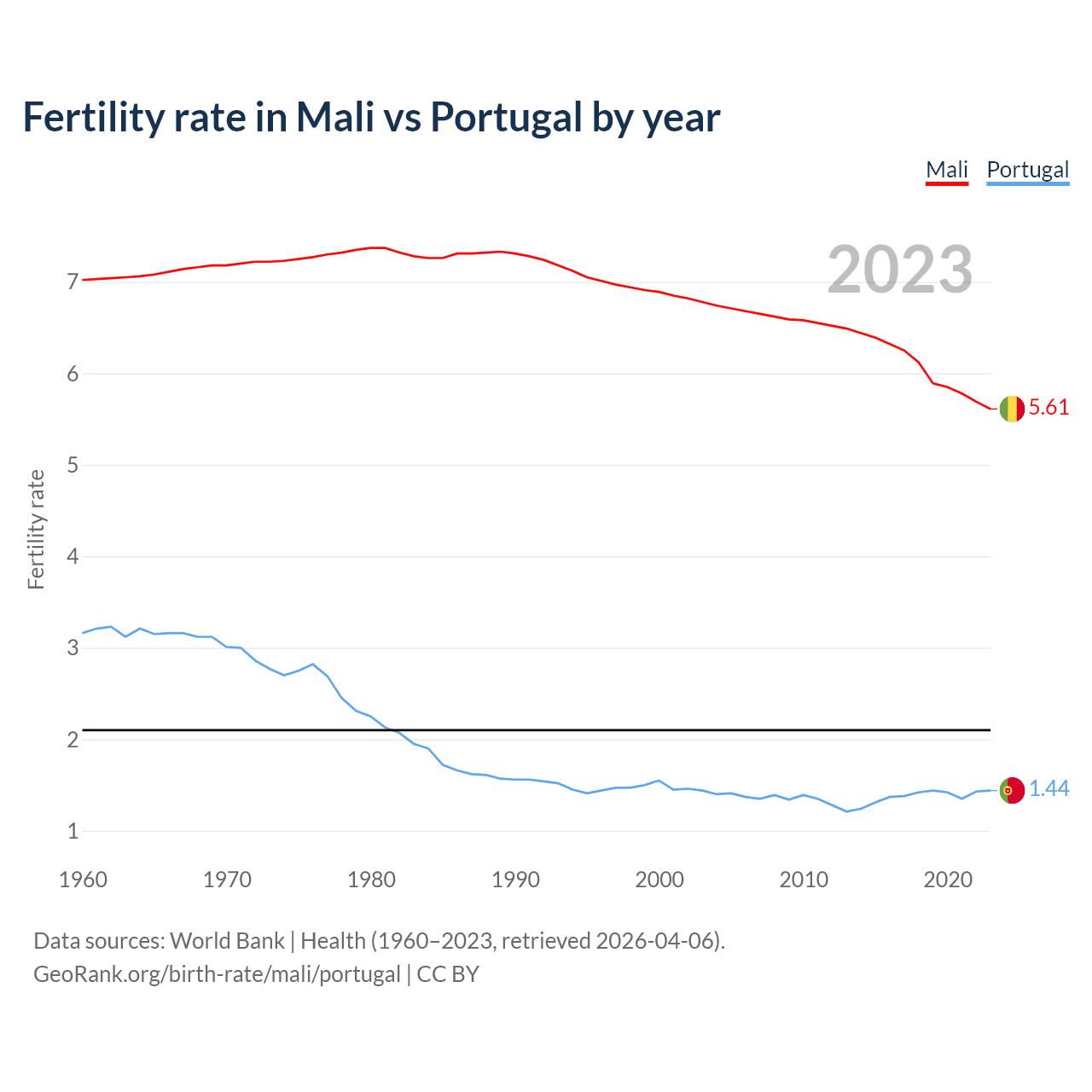 According to the latest available data on birth rates, the fertility rate in Mali was 5.61 children per woman in 2023, compared to 1.44 in Portugal in 2023. The replacement level is considered to be 2.1 children per woman.
