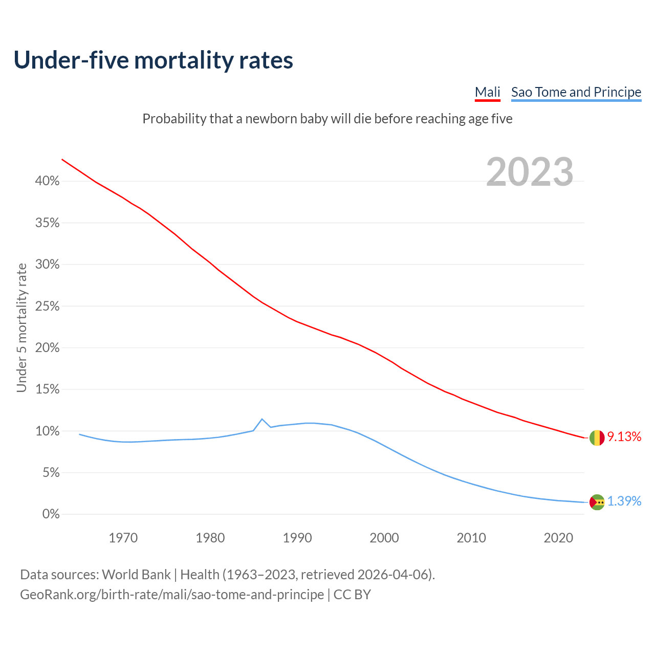The chance that a newborn baby will die before reaching age five is 9.13% in Mali and 1.39% in Sao Tome and Principe. Above is a chart with historical data on under-five mortality rates.