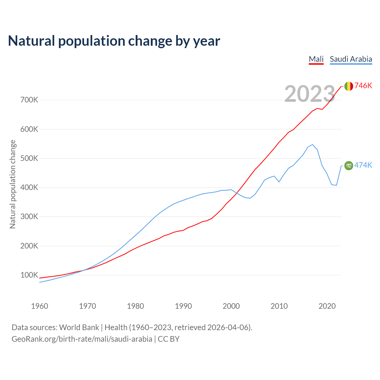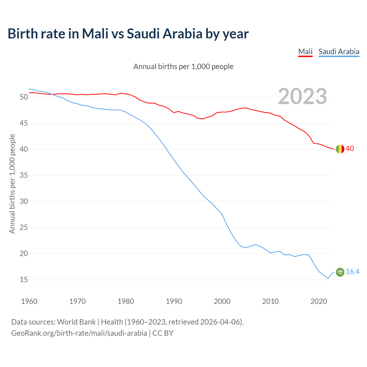 Mali has an annual birth rate of 40 births per 1,000 people, compared to 16.4 for Saudi Arabia. The average number of children a woman is expected to have during her lifetime — the fertility rate, is 5.61 in Mali and 2.28 in Saudi Arabia — 59.4% difference.