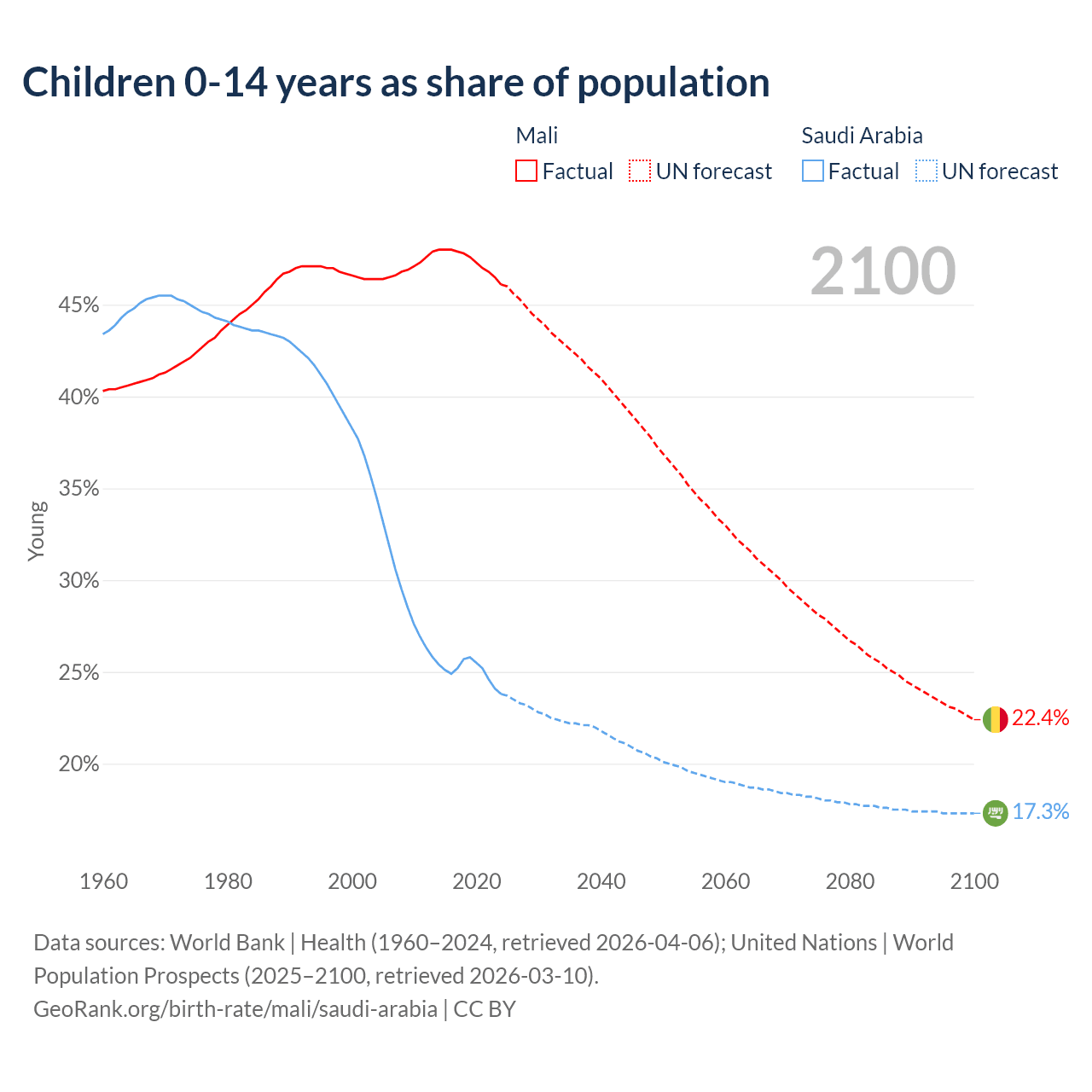 According to the latest available data on birth rates, the fertility rate in Mali was 5.61 children per woman in 2023, compared to 2.28 in Saudi Arabia in 2023. The replacement level is considered to be 2.1 children per woman.