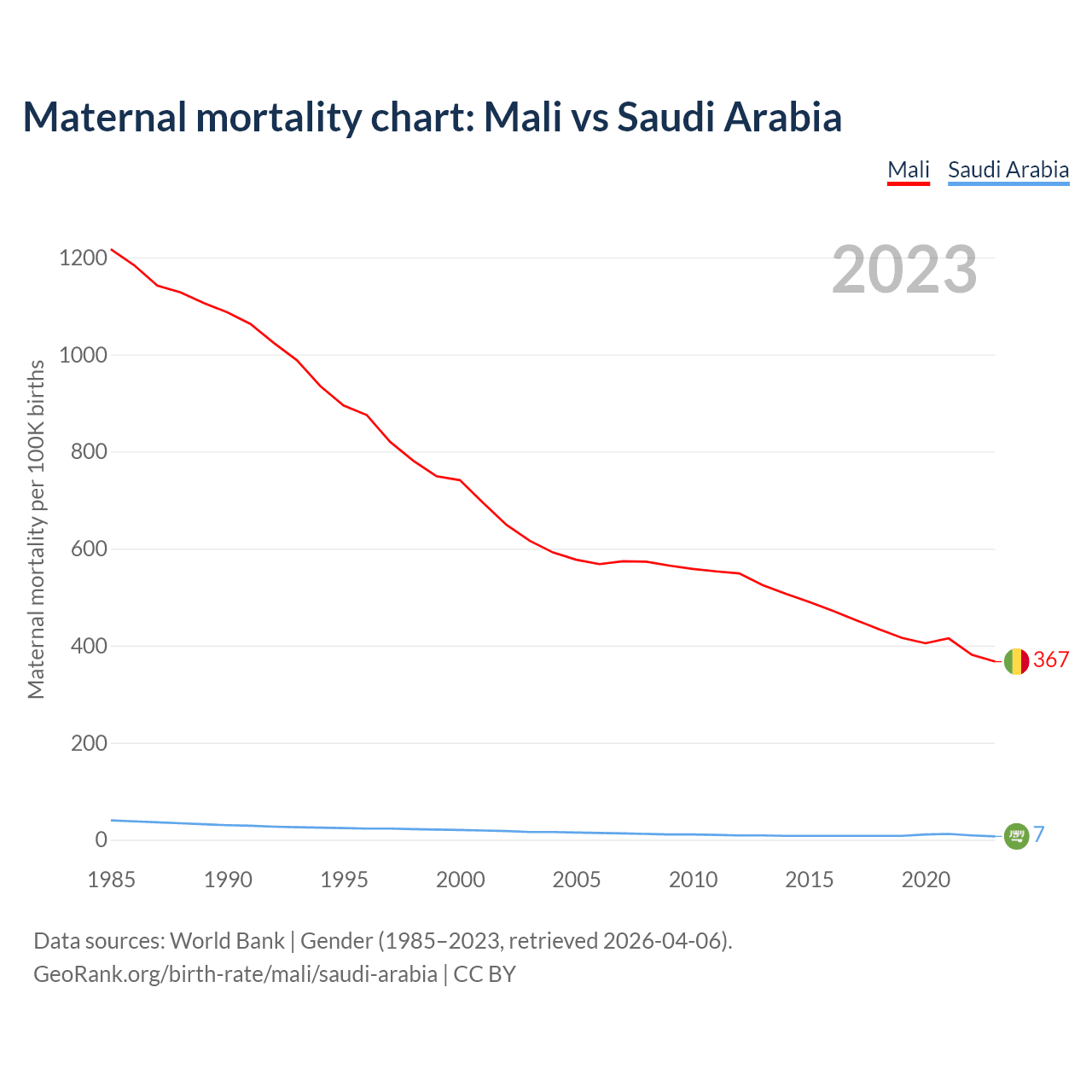 The maternal mortality rate, which is the probability of dying during childbirth or within 42 days of pregnancy termination, is 367 deaths per 100,000 live births in Mali, compared to 7 deaths in Saudi Arabia.