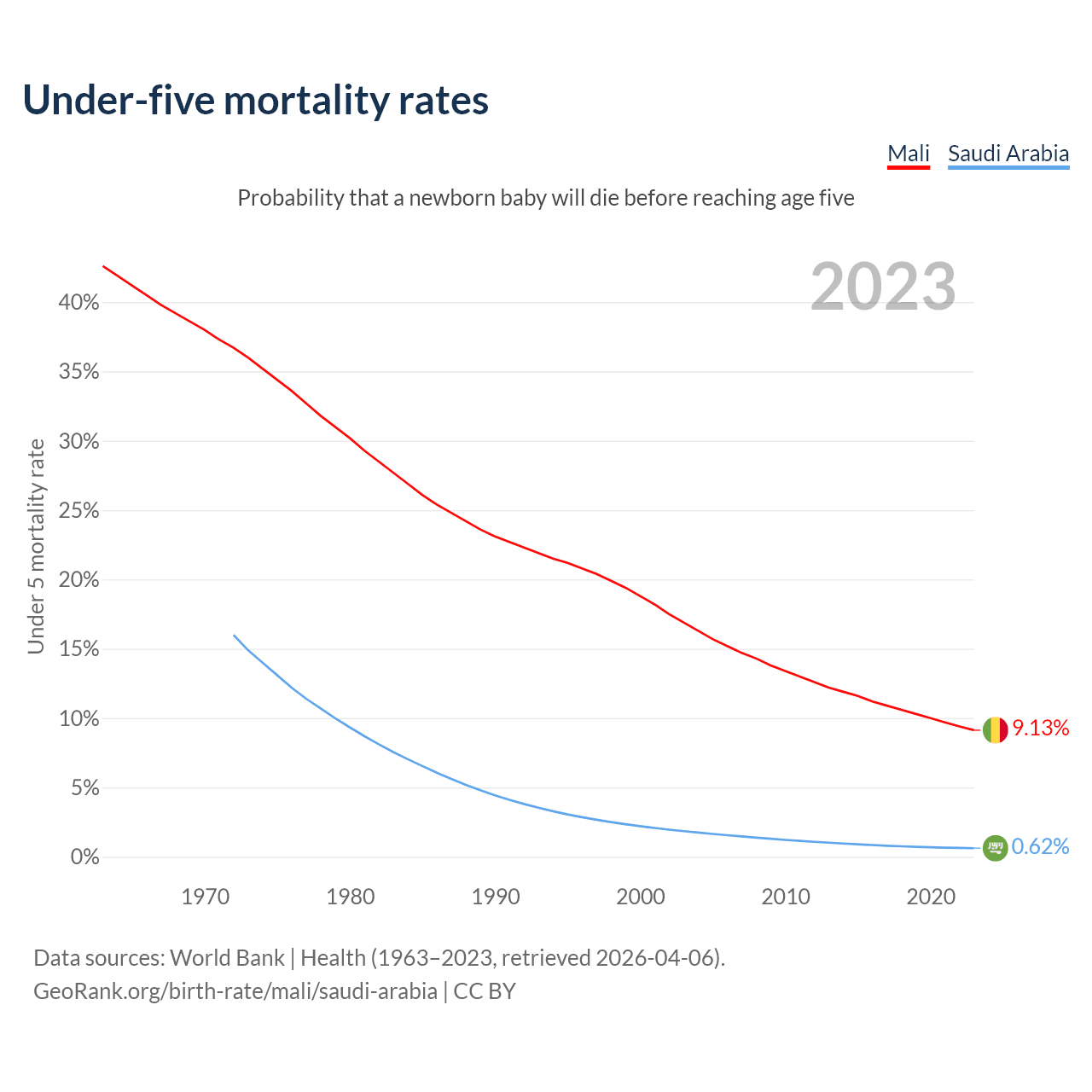 The chance that a newborn baby will die before reaching age five is 9.13% in Mali and 0.62% in Saudi Arabia. Above is a chart with historical data on under-five mortality rates.