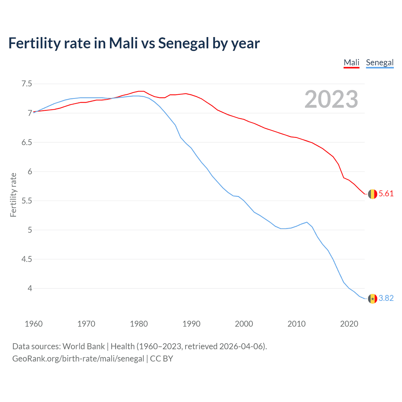 1960 vs 2023, the fertility rate has decreased by 20% in Mali and by 45.4% in Senegal — in 1960, it was 7.02 and 7, respectively.