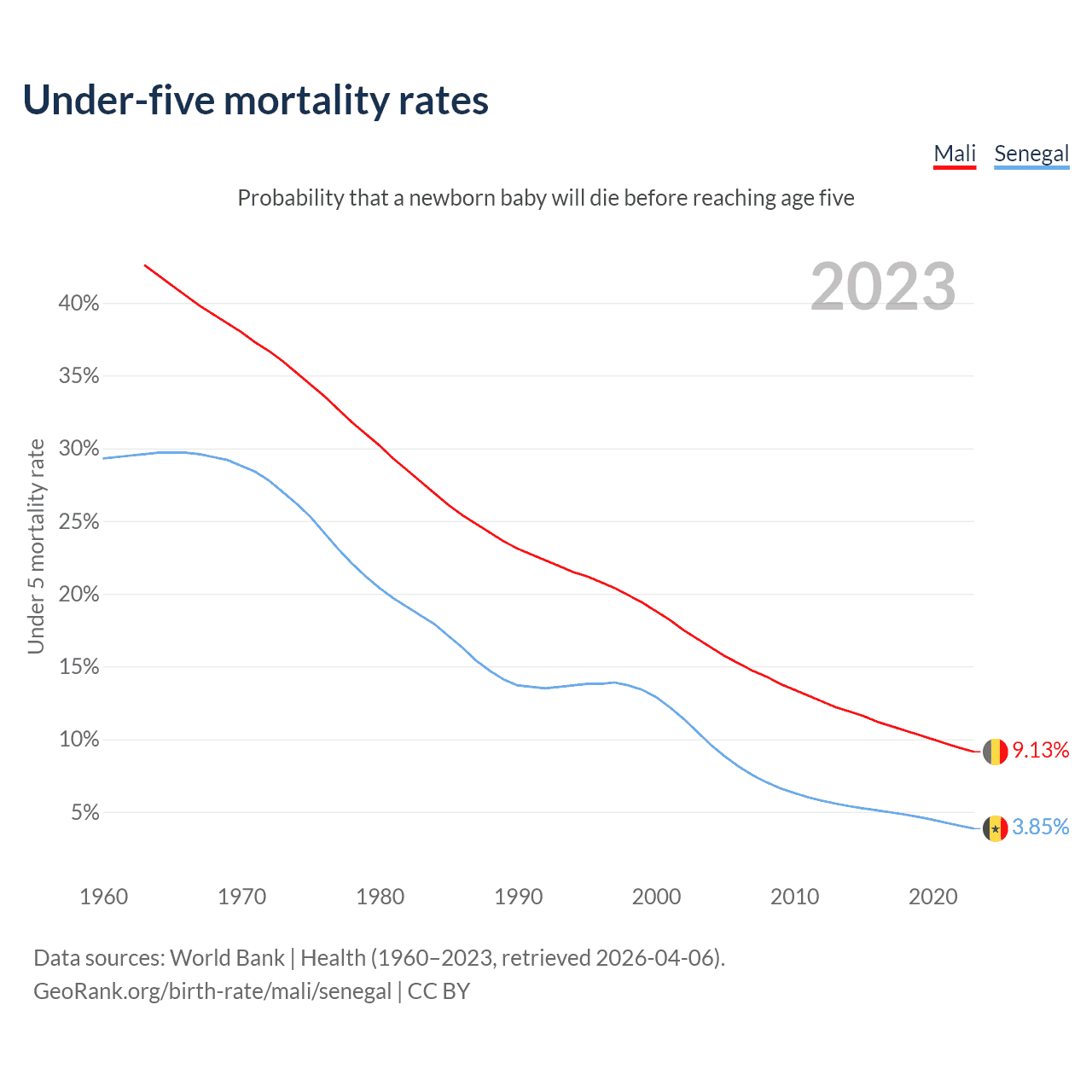 The chance that a newborn baby will die before reaching age five is 9.13% in Mali and 3.85% in Senegal. Above is a chart with historical data on under-five mortality rates.