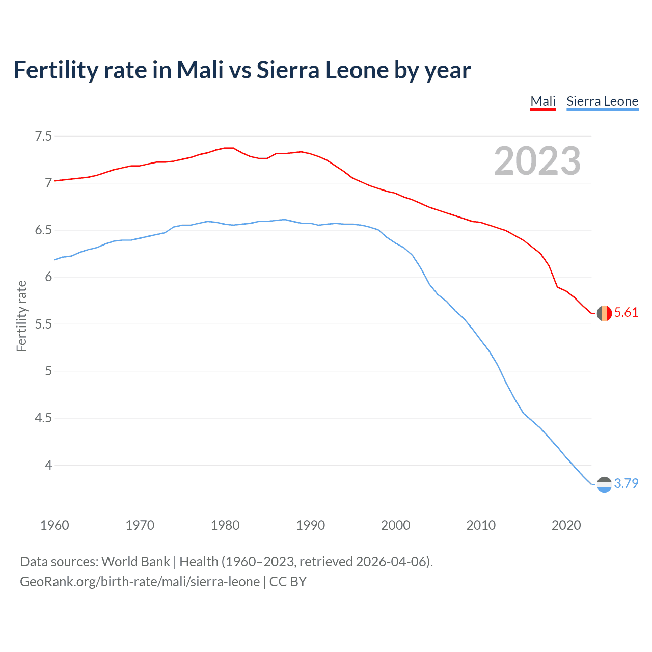 1960 vs 2023, the fertility rate has decreased by 20% in Mali and by 38.6% in Sierra Leone — in 1960, it was 7.02 and 6.18, respectively.