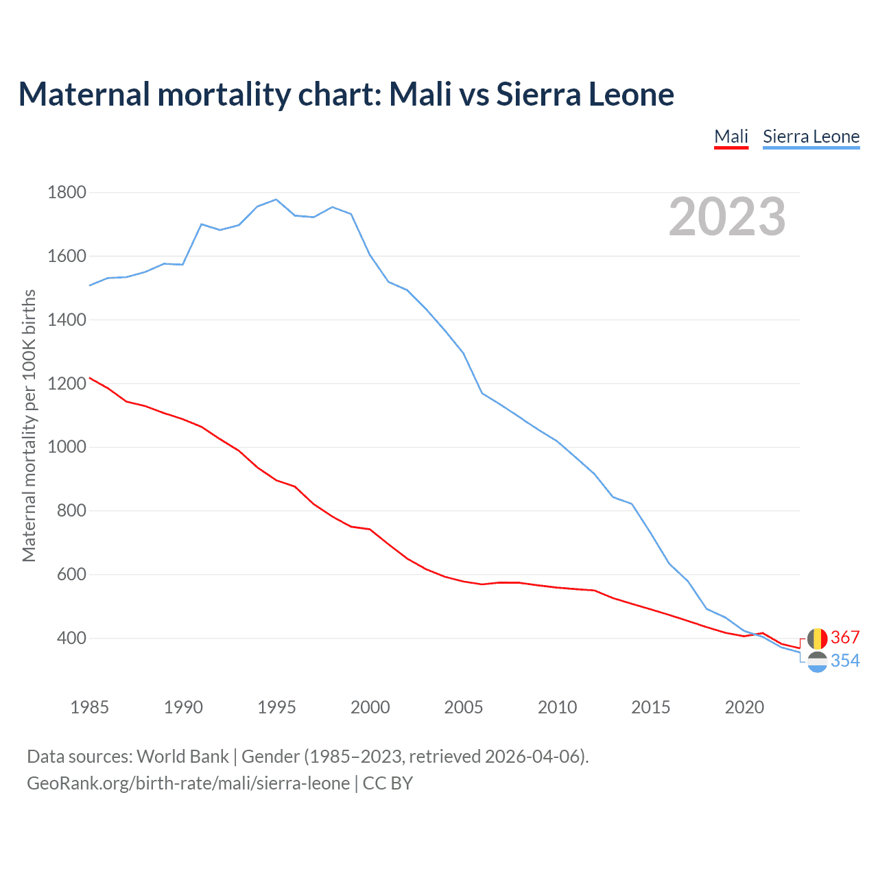 The maternal mortality rate, which is the probability of dying during childbirth or within 42 days of pregnancy termination, is 367 deaths per 100,000 live births in Mali, compared to 354 deaths in Sierra Leone.
