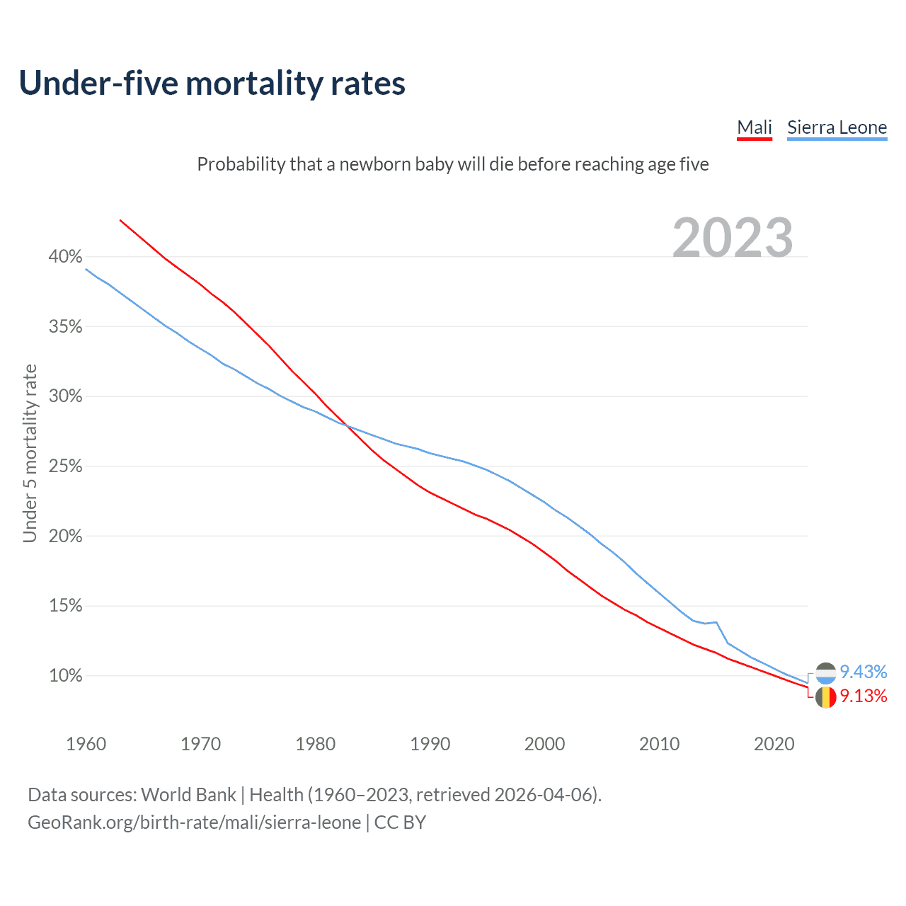 The chance that a newborn baby will die before reaching age five is 9.13% in Mali and 9.43% in Sierra Leone. Above is a chart with historical data on under-five mortality rates.