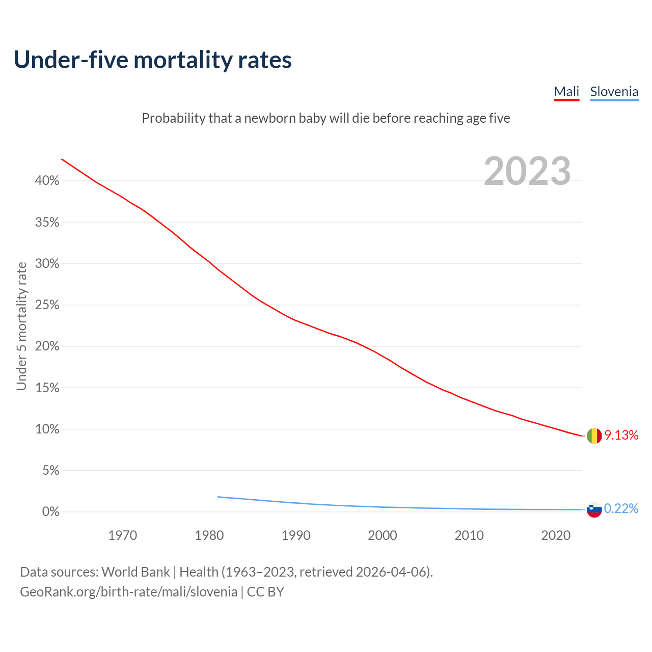 The chance that a newborn baby will die before reaching age five is 9.13% in Mali and 0.22% in Slovenia. Above is a chart with historical data on under-five mortality rates.