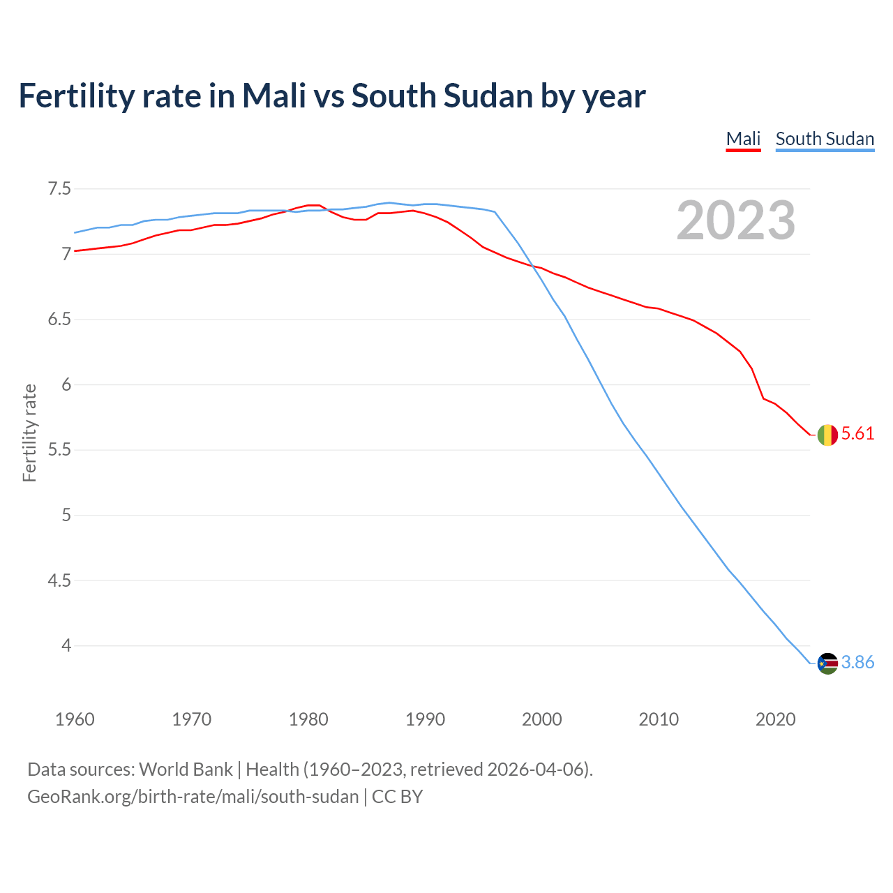 1960 vs 2023, the fertility rate has decreased by 20% in Mali and by 46% in South Sudan — in 1960, it was 7.02 and 7.16, respectively.