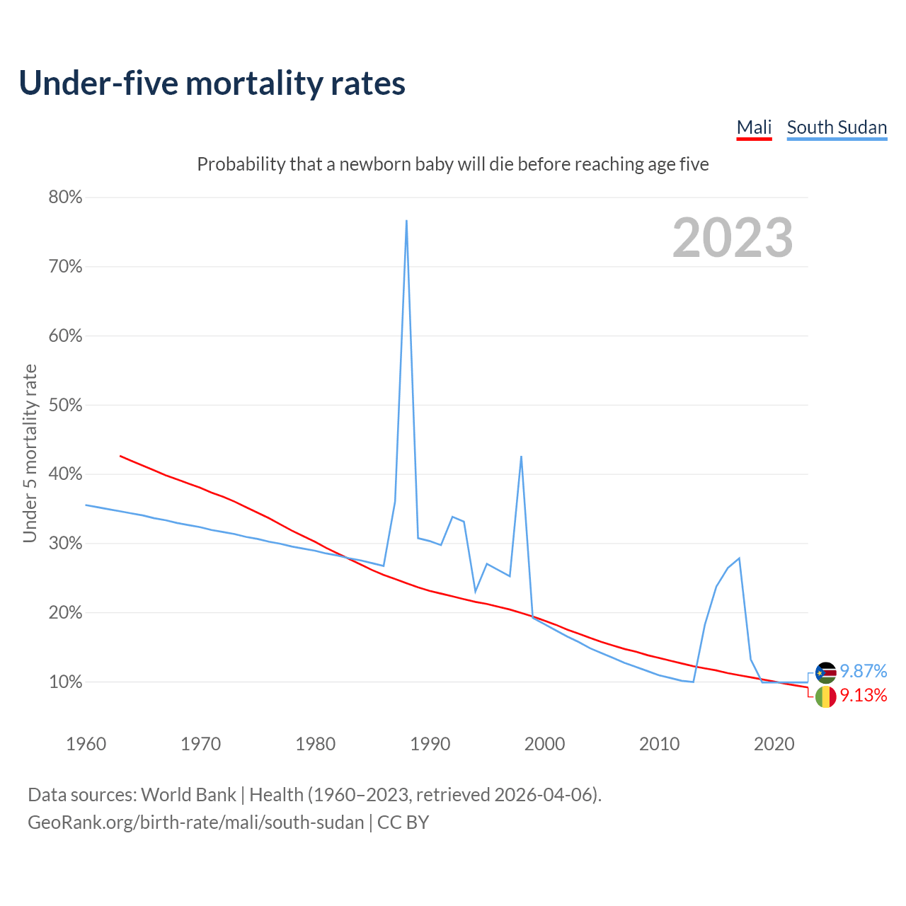 The chance that a newborn baby will die before reaching age five is 9.13% in Mali and 9.87% in South Sudan. Above is a chart with historical data on under-five mortality rates.