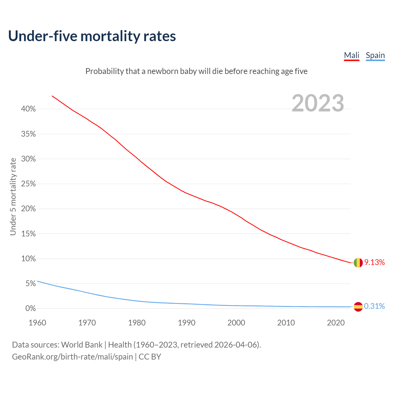 The chance that a newborn baby will die before reaching age five is 9.13% in Mali and 0.31% in Spain. Above is a chart with historical data on under-five mortality rates.