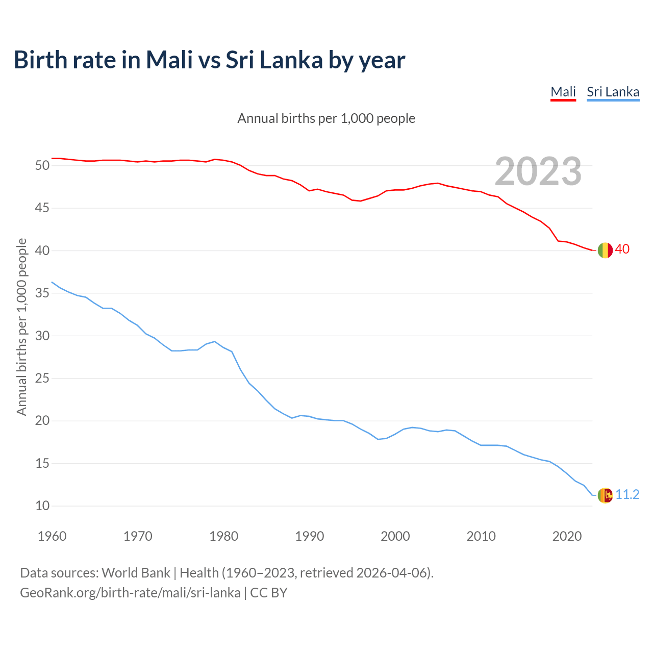 Mali has an annual birth rate of 40 births per 1,000 people, compared to 11.2 for Sri Lanka. The average number of children a woman is expected to have during her lifetime — the fertility rate, is 5.61 in Mali and 1.97 in Sri Lanka — 64.8% difference.