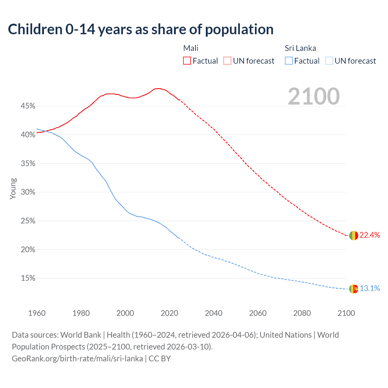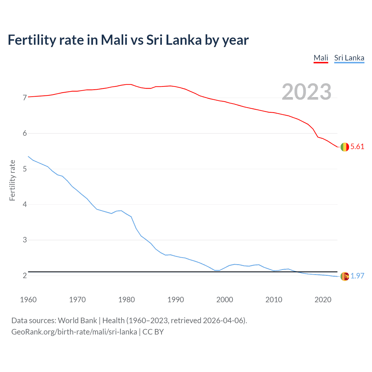 According to the latest available data on birth rates, the fertility rate in Mali was 5.61 children per woman in 2023, compared to 1.97 in Sri Lanka in 2023. The replacement level is considered to be 2.1 children per woman.