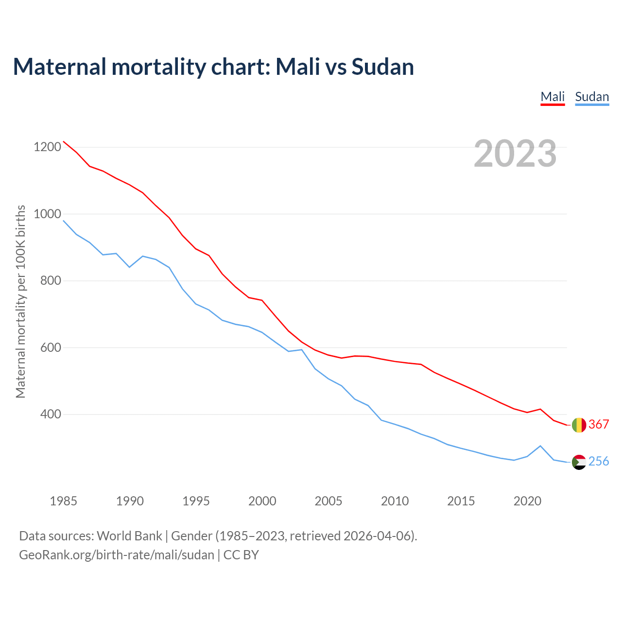 The maternal mortality rate, which is the probability of dying during childbirth or within 42 days of pregnancy termination, is 367 deaths per 100,000 live births in Mali, compared to 256 deaths in Sudan.