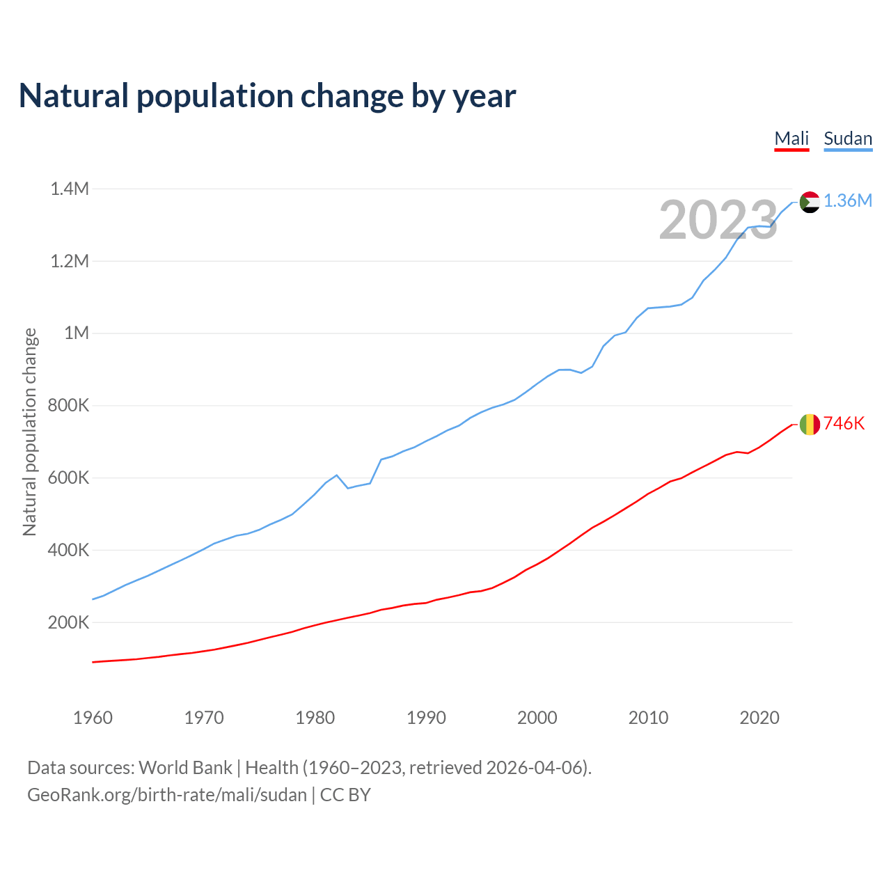 1960 vs 2023, the fertility rate has decreased by 20% in Mali and by 35.1% in Sudan — in 1960, it was 7.02 and 6.66, respectively.