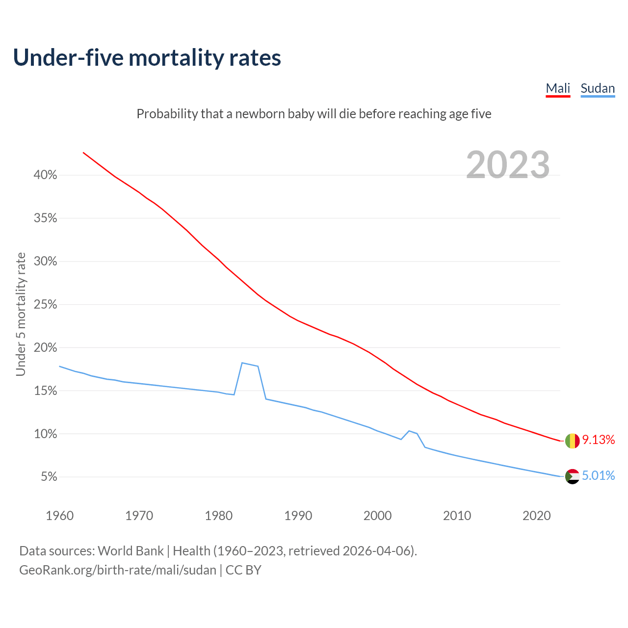 The chance that a newborn baby will die before reaching age five is 9.13% in Mali and 5.01% in Sudan. Above is a chart with historical data on under-five mortality rates.
