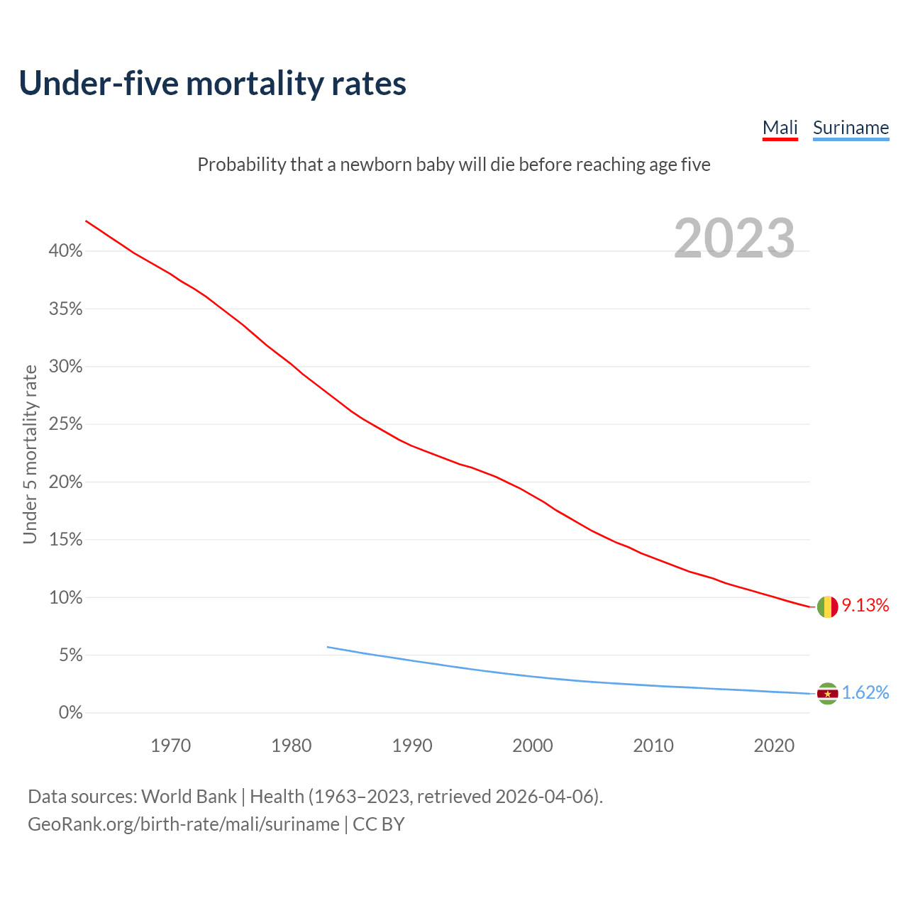The chance that a newborn baby will die before reaching age five is 9.13% in Mali and 1.62% in Suriname. Above is a chart with historical data on under-five mortality rates.