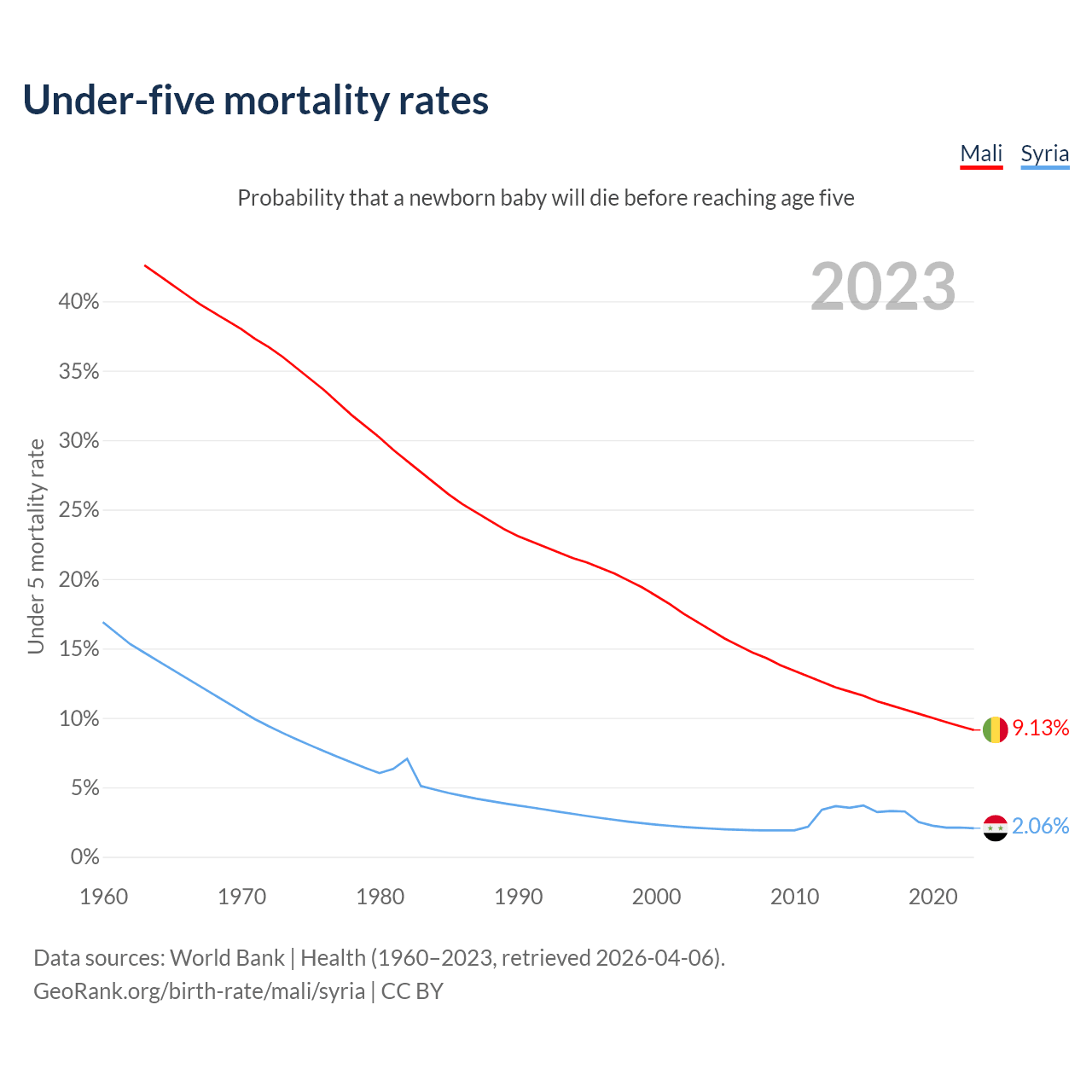 The chance that a newborn baby will die before reaching age five is 9.13% in Mali and 2.06% in Syria. Above is a chart with historical data on under-five mortality rates.