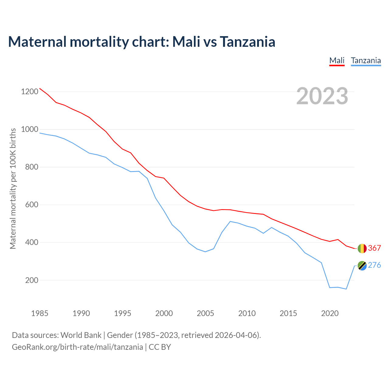 The maternal mortality rate, which is the probability of dying during childbirth or within 42 days of pregnancy termination, is 367 deaths per 100,000 live births in Mali, compared to 276 deaths in Tanzania.