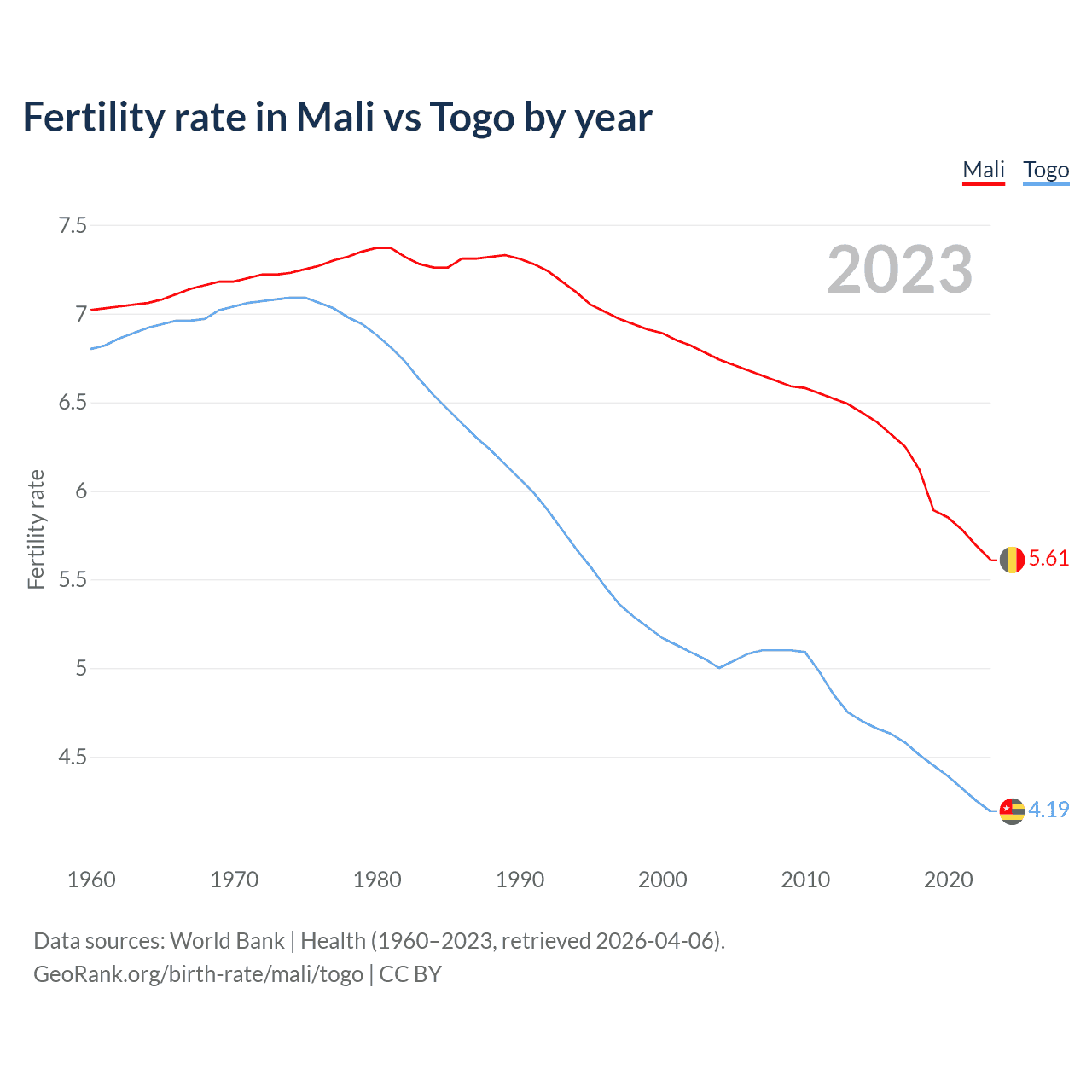1960 vs 2023, the fertility rate has decreased by 20% in Mali and by 38.3% in Togo — in 1960, it was 7.02 and 6.8, respectively.