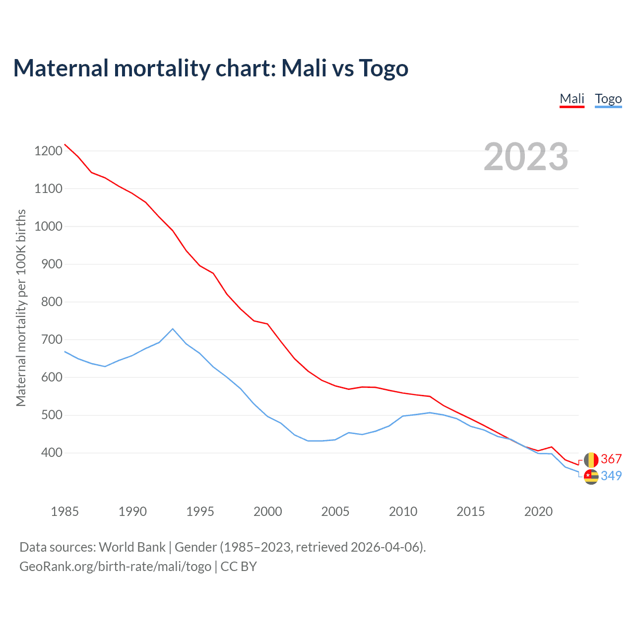 The maternal mortality rate, which is the probability of dying during childbirth or within 42 days of pregnancy termination, is 367 deaths per 100,000 live births in Mali, compared to 349 deaths in Togo.
