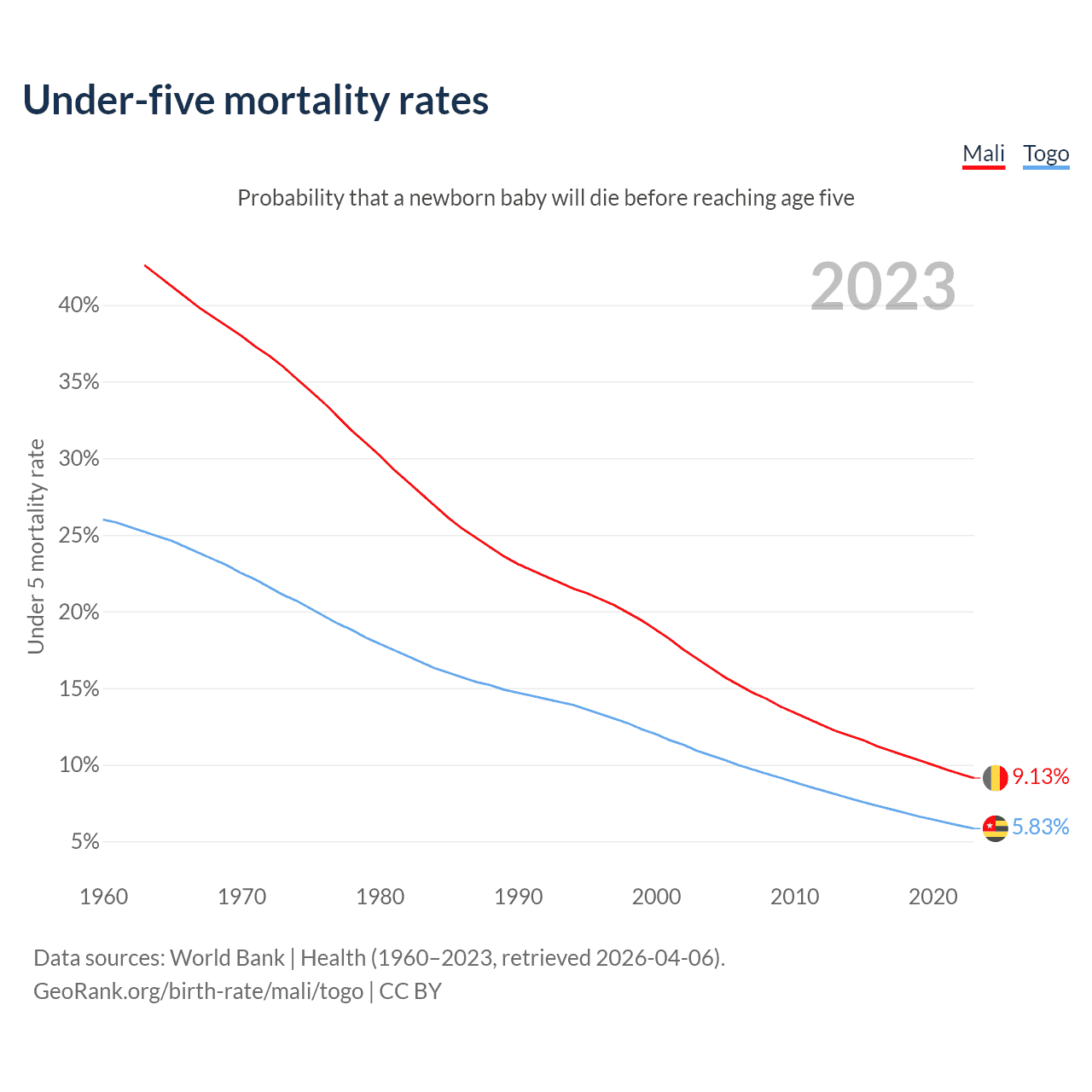 The chance that a newborn baby will die before reaching age five is 9.13% in Mali and 5.83% in Togo. Above is a chart with historical data on under-five mortality rates.