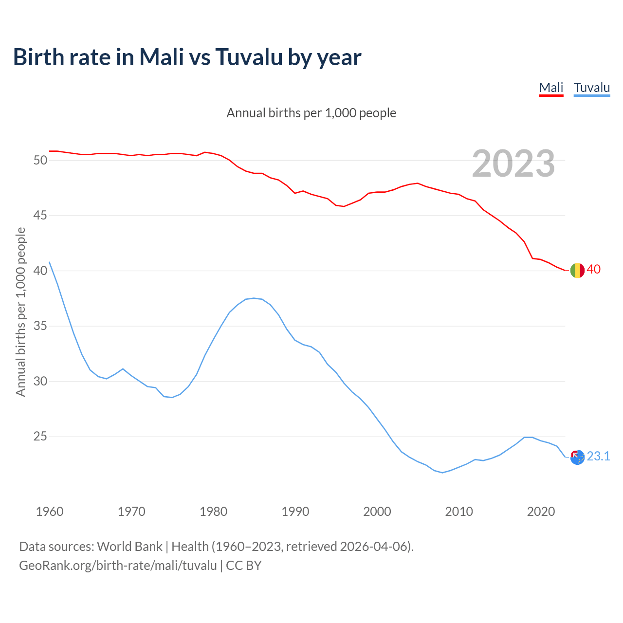 Mali has an annual birth rate of 40 births per 1,000 people, compared to 23.1 for Tuvalu. The average number of children a woman is expected to have during her lifetime — the fertility rate, is 5.61 in Mali and 3.21 in Tuvalu — 42.9% difference.