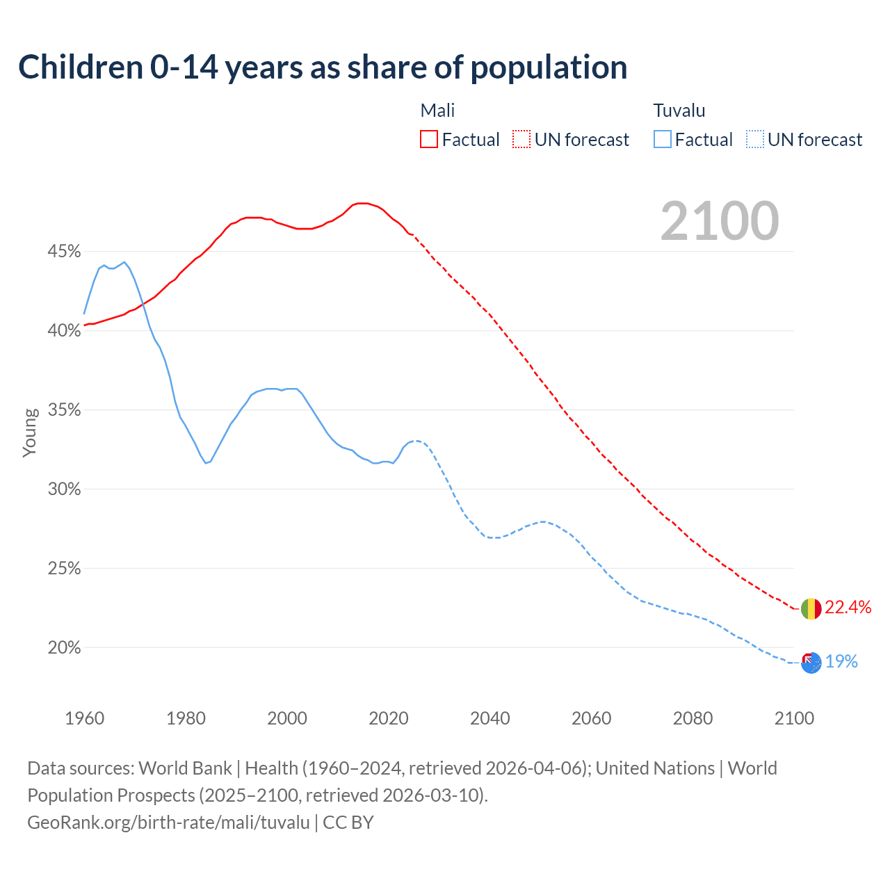 According to the latest available data on birth rates, the fertility rate in Mali was 5.61 children per woman in 2023, compared to 3.21 in Tuvalu in 2023. The replacement level is considered to be 2.1 children per woman.