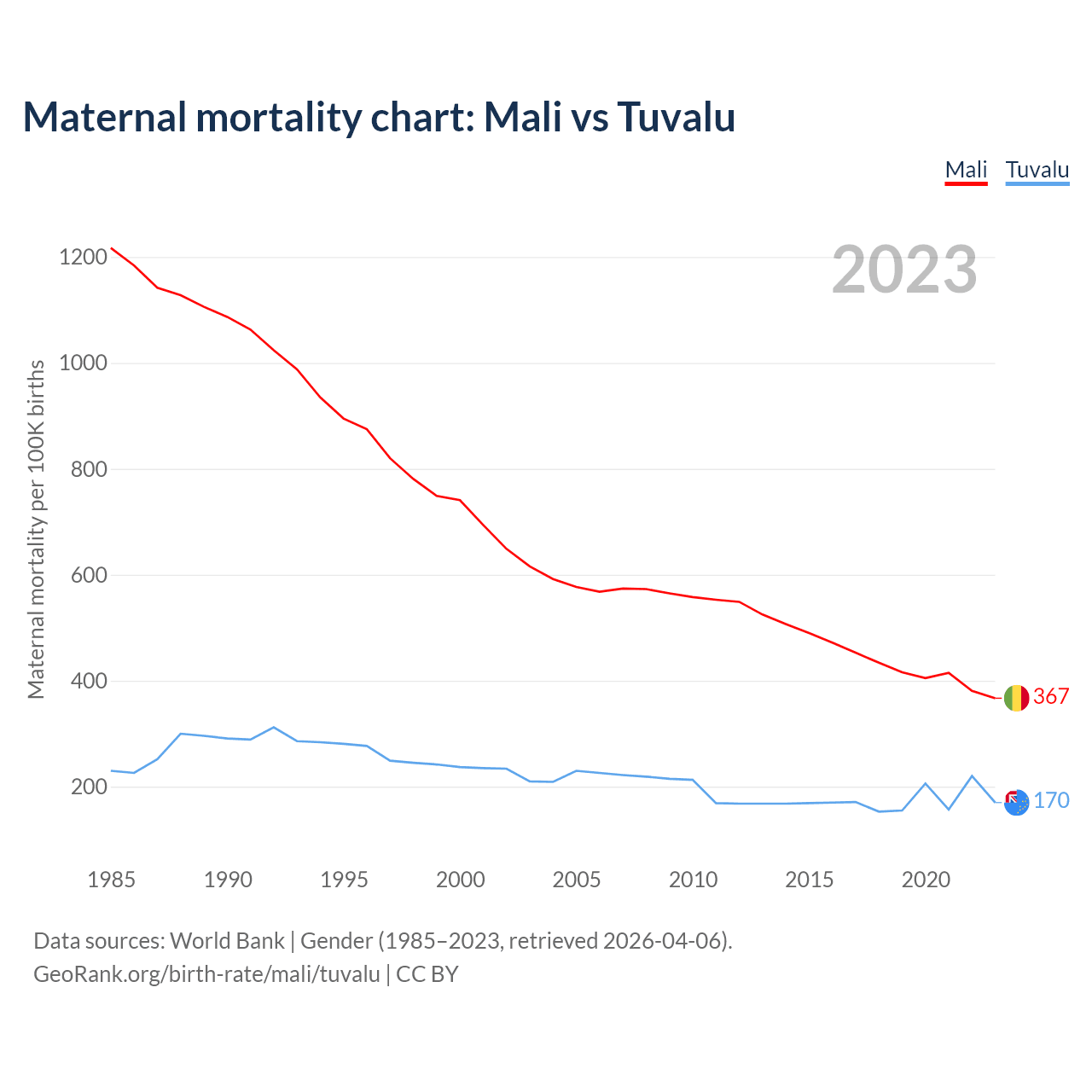 The maternal mortality rate, which is the probability of dying during childbirth or within 42 days of pregnancy termination, is 367 deaths per 100,000 live births in Mali, compared to 170 deaths in Tuvalu.