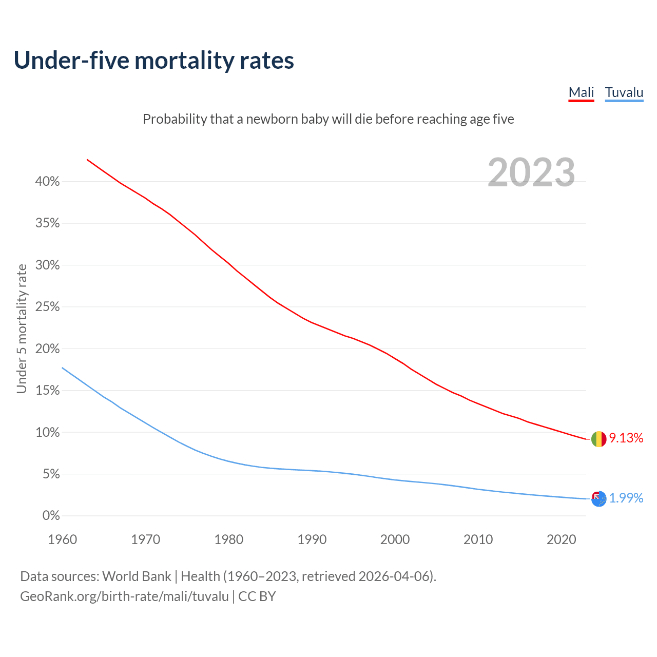The chance that a newborn baby will die before reaching age five is 9.13% in Mali and 1.99% in Tuvalu. Above is a chart with historical data on under-five mortality rates.