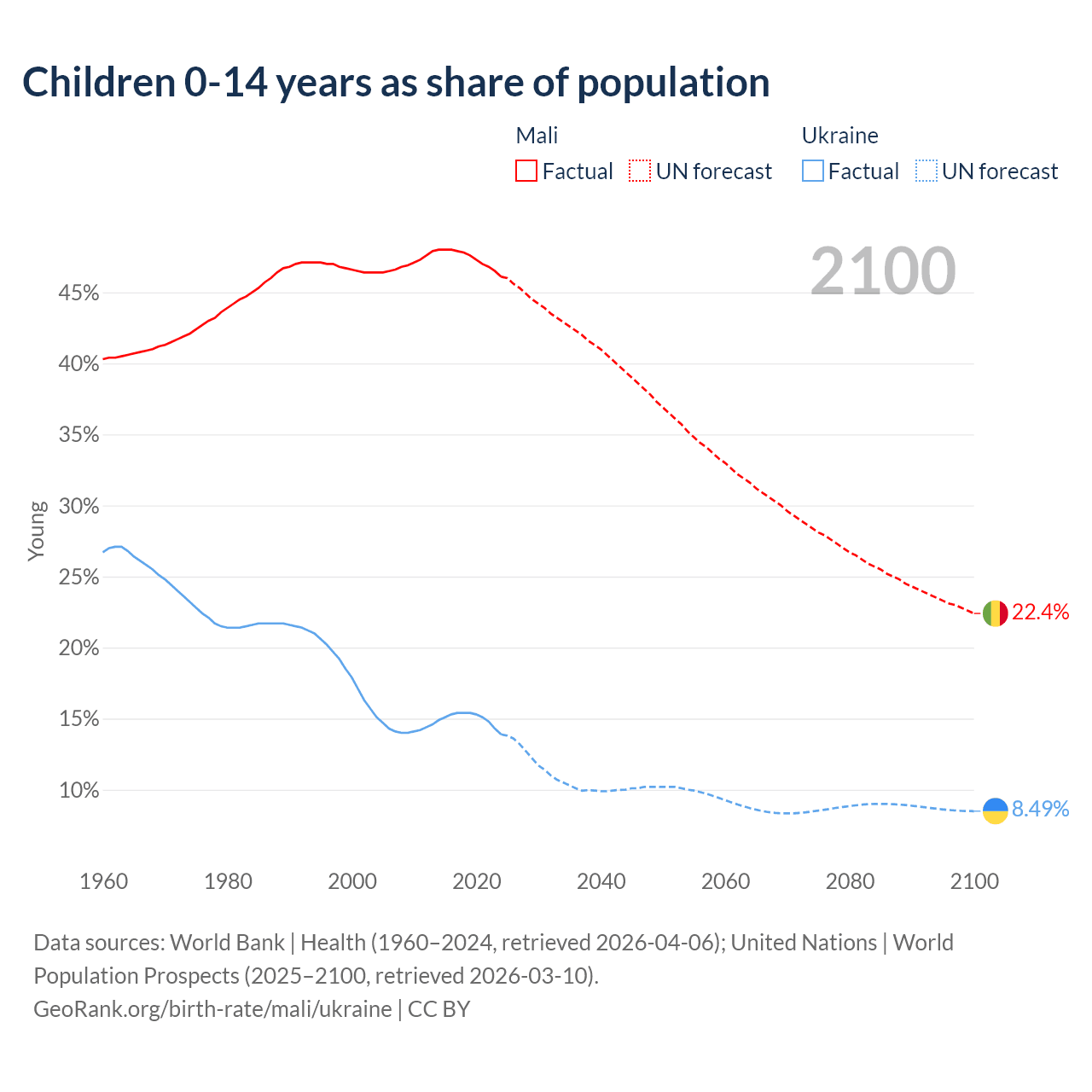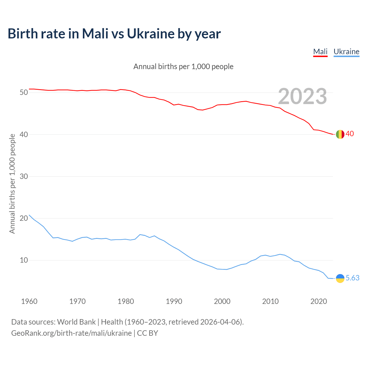 Mali has an annual birth rate of 40 births per 1,000 people, compared to 5.63 for Ukraine. The average number of children a woman is expected to have during her lifetime — the fertility rate, is 5.61 in Mali and 0.98 in Ukraine — 82.6% difference.