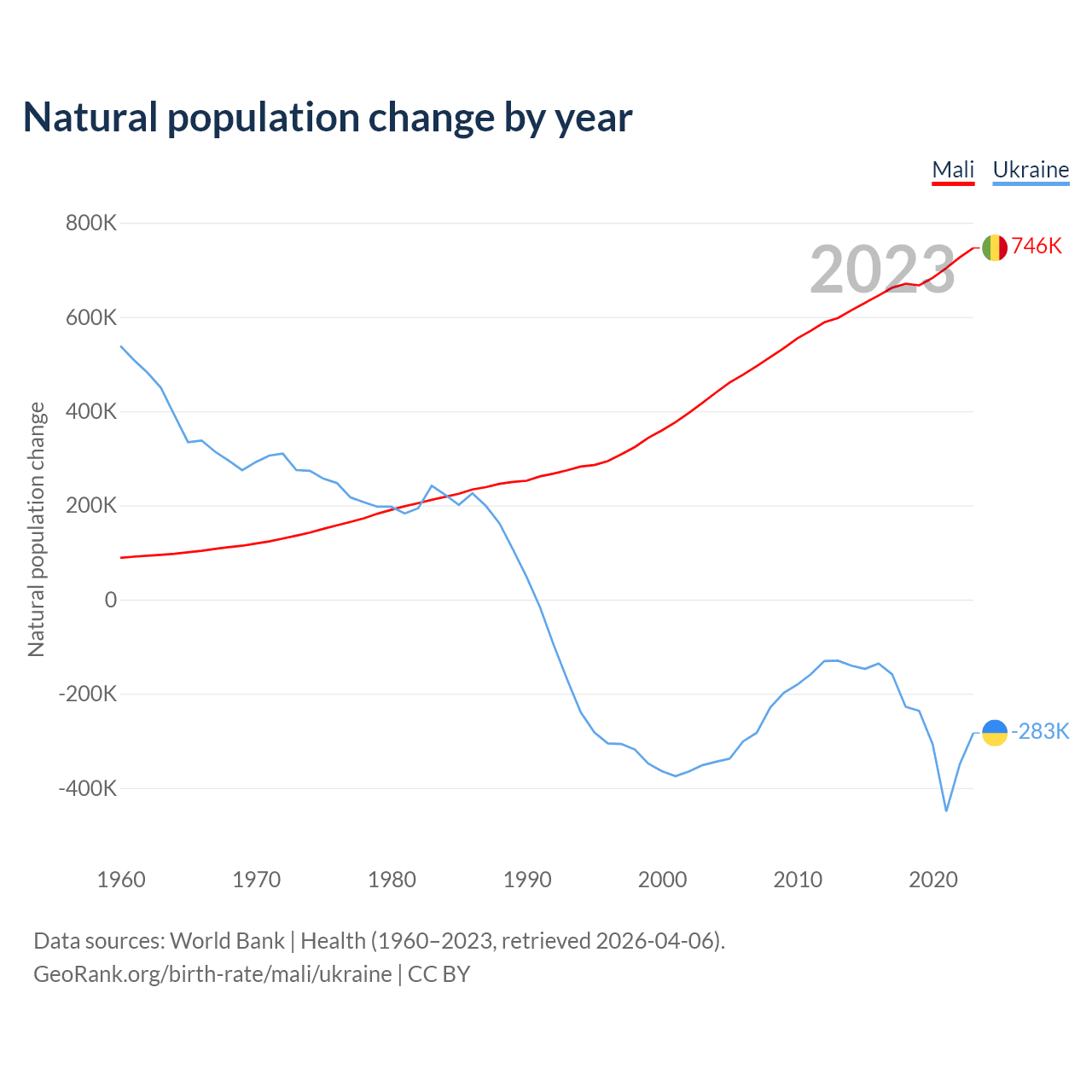 According to the latest available data on birth rates, the fertility rate in Mali was 5.61 children per woman in 2023, compared to 0.98 in Ukraine in 2023. The replacement level is considered to be 2.1 children per woman.