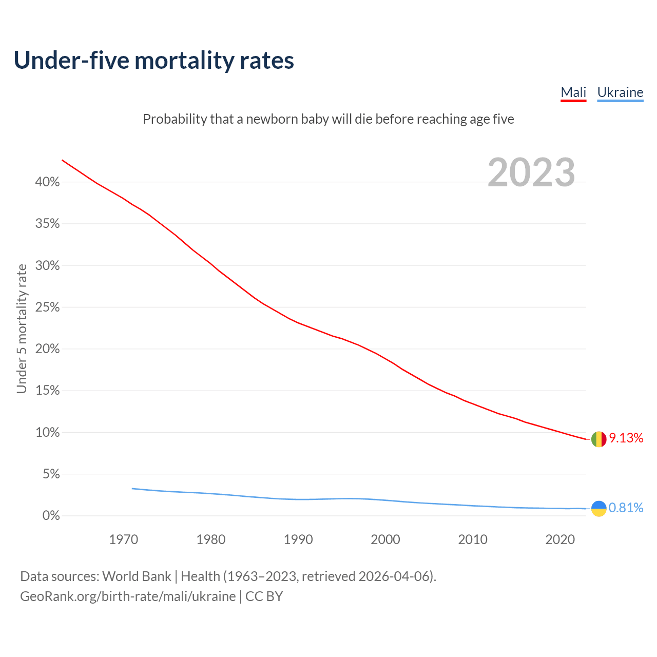 The chance that a newborn baby will die before reaching age five is 9.13% in Mali and 0.81% in Ukraine. Above is a chart with historical data on under-five mortality rates.