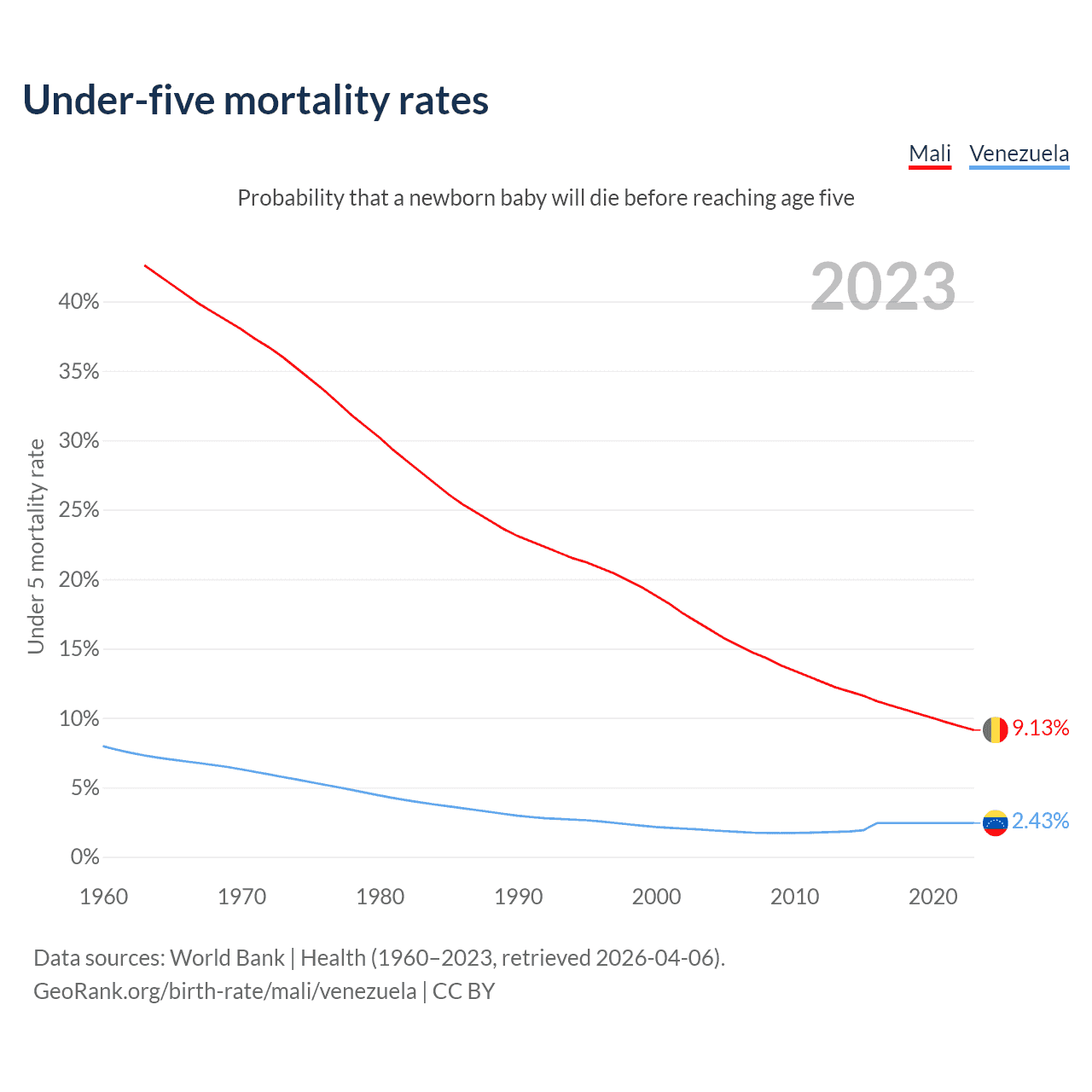 The chance that a newborn baby will die before reaching age five is 9.13% in Mali and 2.43% in Venezuela. Above is a chart with historical data on under-five mortality rates.