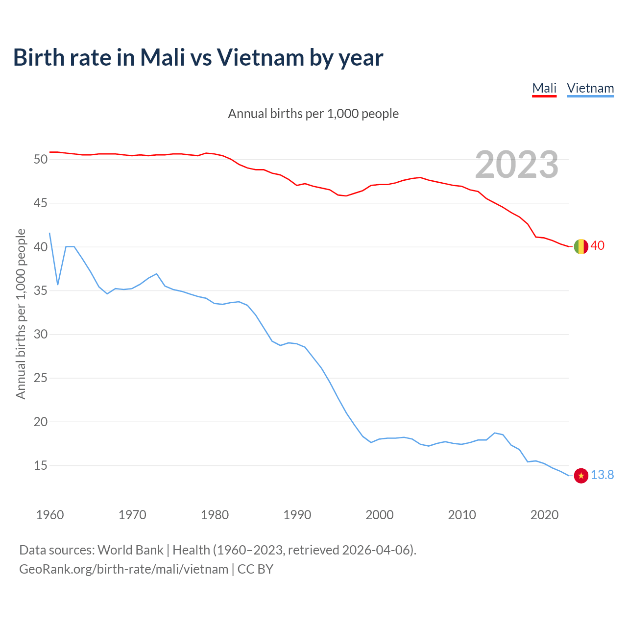 Mali has an annual birth rate of 40 births per 1,000 people, compared to 13.8 for Vietnam. The average number of children a woman is expected to have during her lifetime — the fertility rate, is 5.61 in Mali and 1.91 in Vietnam — 65.9% difference.