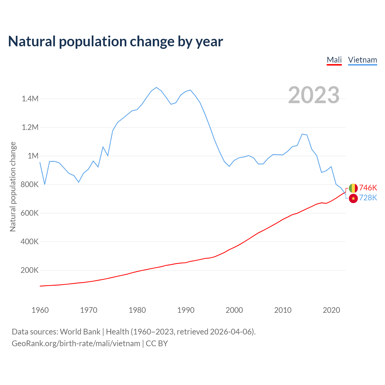 According to the latest available data on birth rates, the fertility rate in Mali was 5.61 children per woman in 2023, compared to 1.91 in Vietnam in 2023. The replacement level is considered to be 2.1 children per woman.