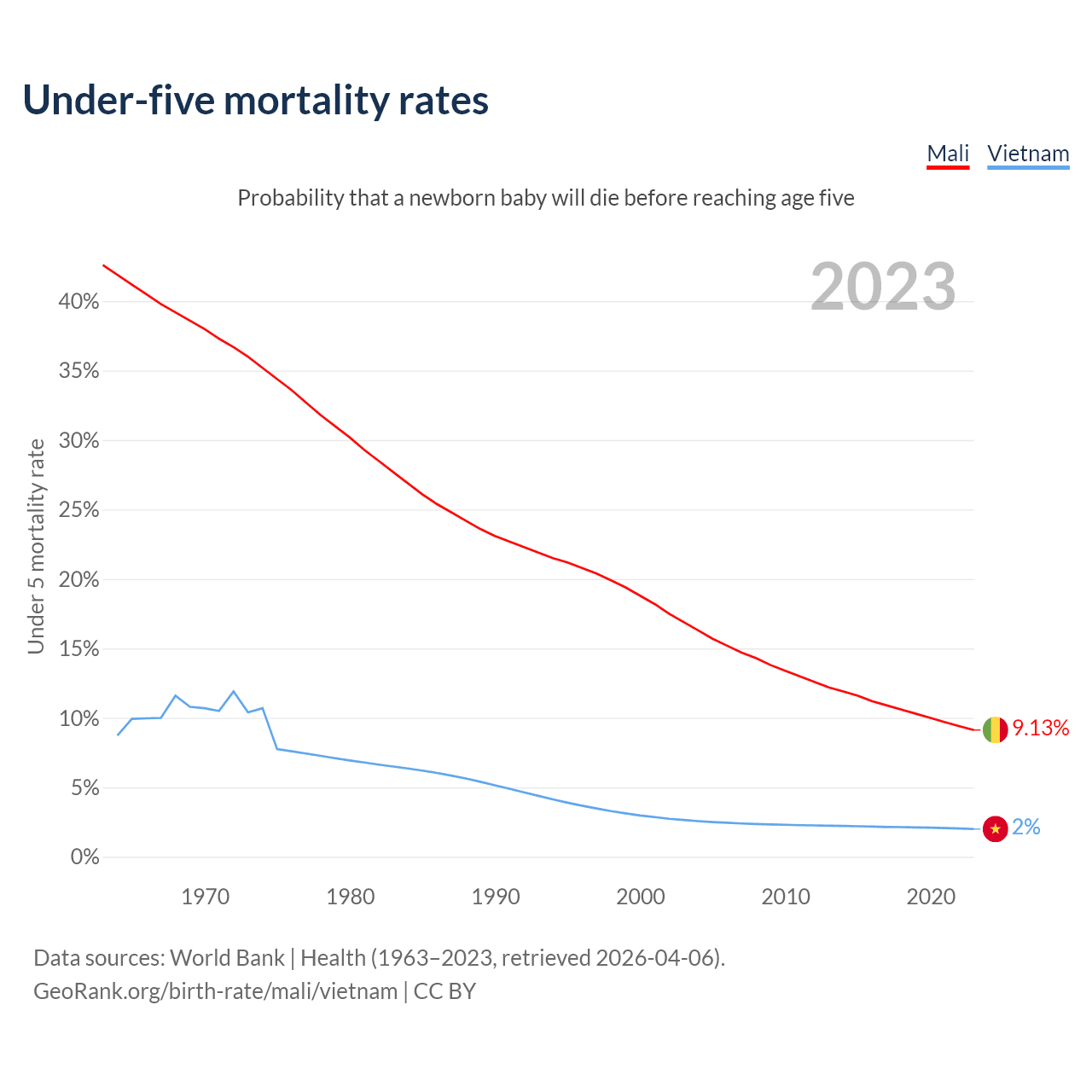 The chance that a newborn baby will die before reaching age five is 9.13% in Mali and 2% in Vietnam. Above is a chart with historical data on under-five mortality rates.