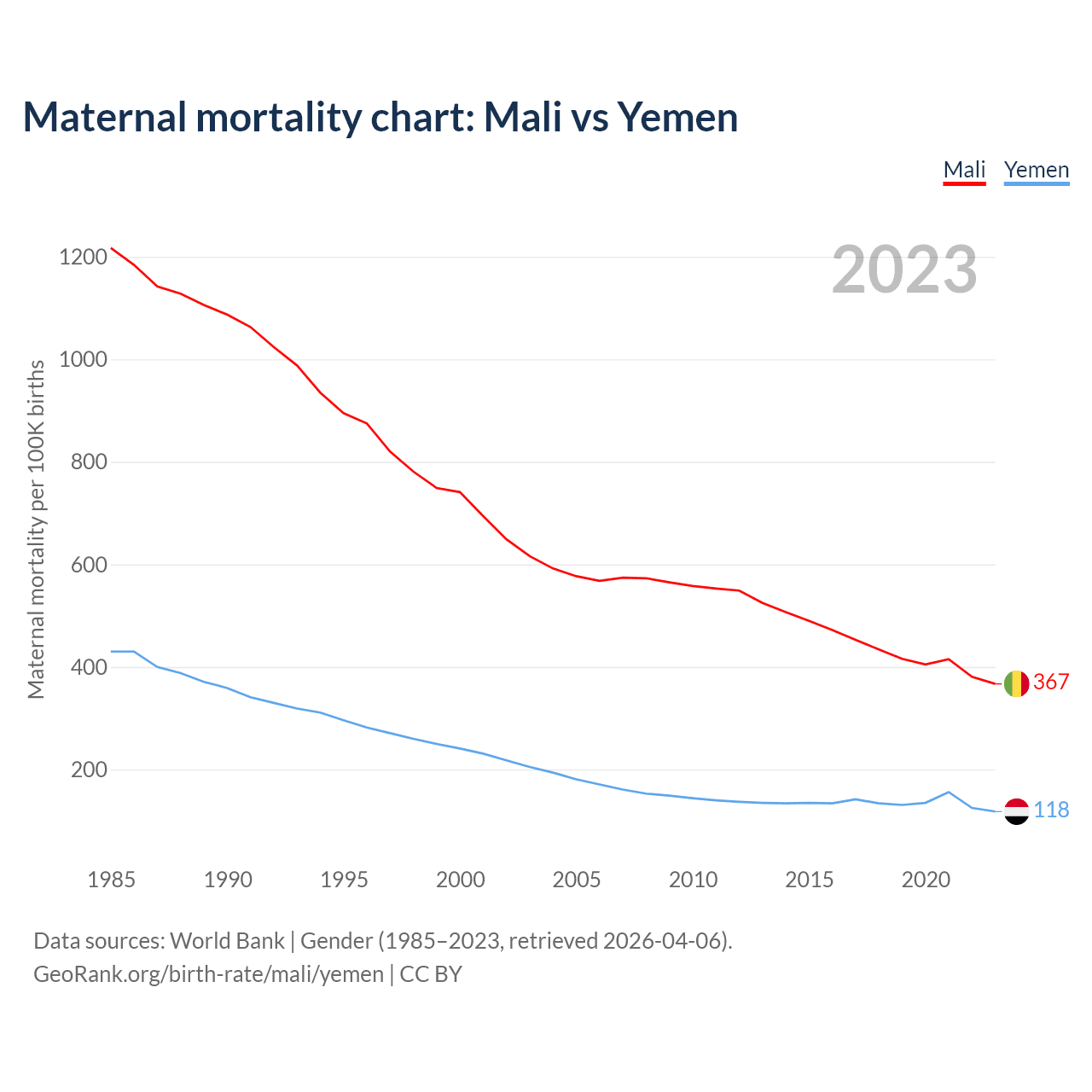 The maternal mortality rate, which is the probability of dying during childbirth or within 42 days of pregnancy termination, is 367 deaths per 100,000 live births in Mali, compared to 118 deaths in Yemen.