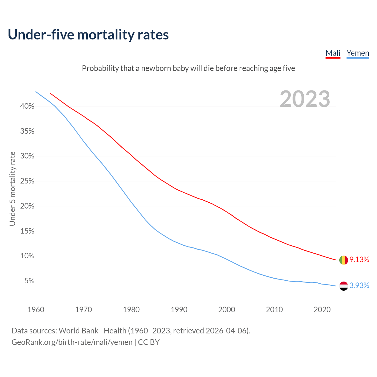 The chance that a newborn baby will die before reaching age five is 9.13% in Mali and 3.93% in Yemen. Above is a chart with historical data on under-five mortality rates.