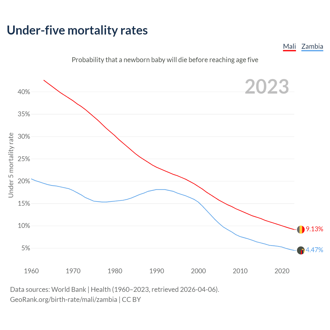 The chance that a newborn baby will die before reaching age five is 9.13% in Mali and 4.47% in Zambia. Above is a chart with historical data on under-five mortality rates.