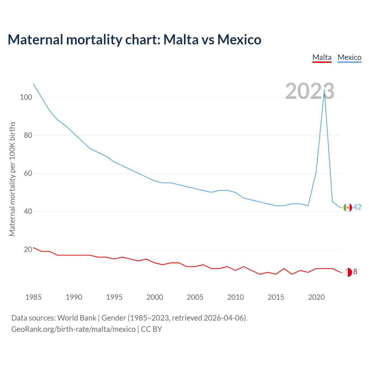 The maternal mortality rate, which is the probability of dying during childbirth or within 42 days of pregnancy termination, is 8 deaths per 100,000 live births in Malta, compared to 42 deaths in Mexico.