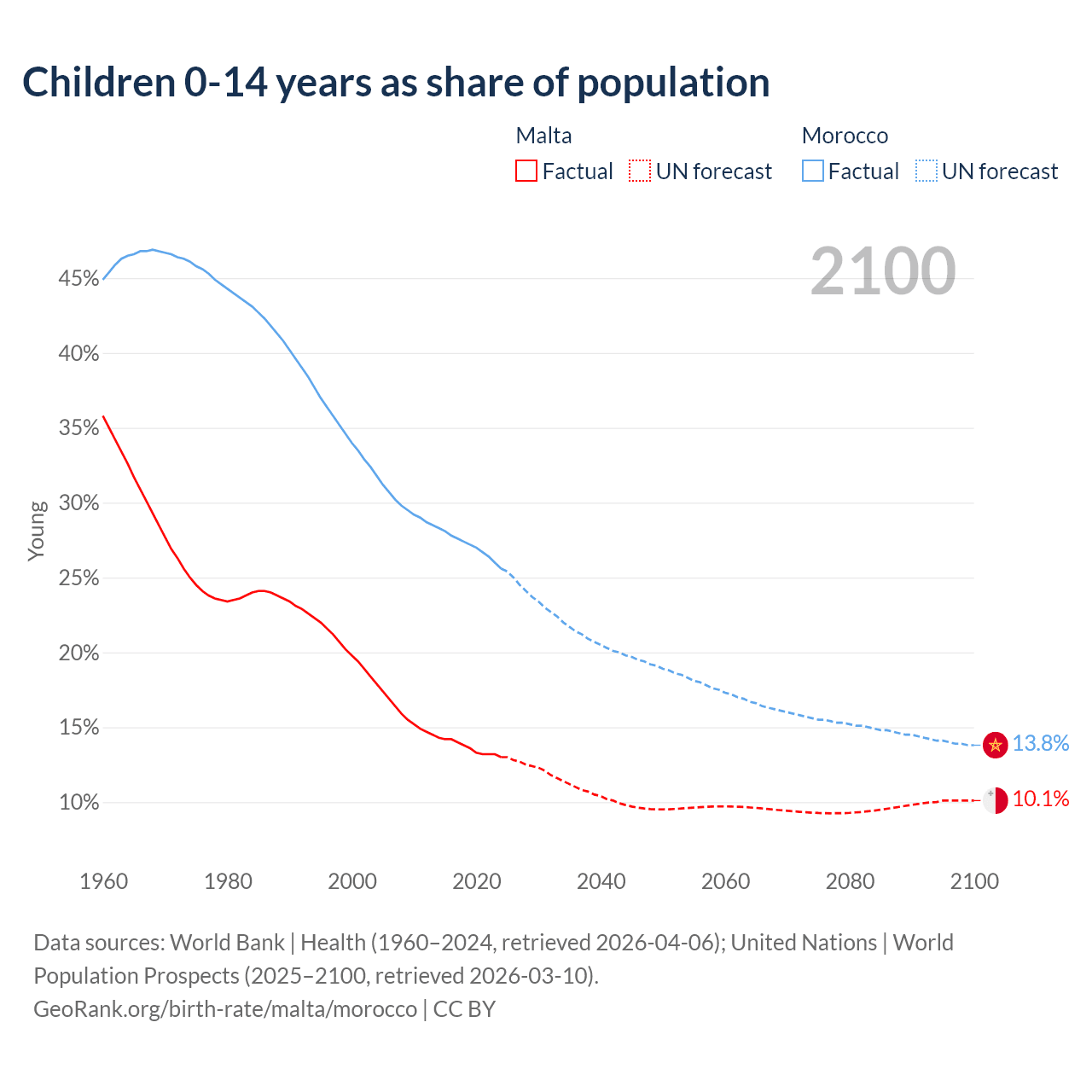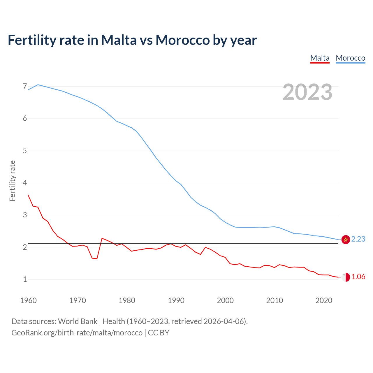 According to the latest available data on birth rates, the fertility rate in Malta was 1.06 children per woman in 2023, compared to 2.23 in Morocco in 2023. The replacement level is considered to be 2.1 children per woman.