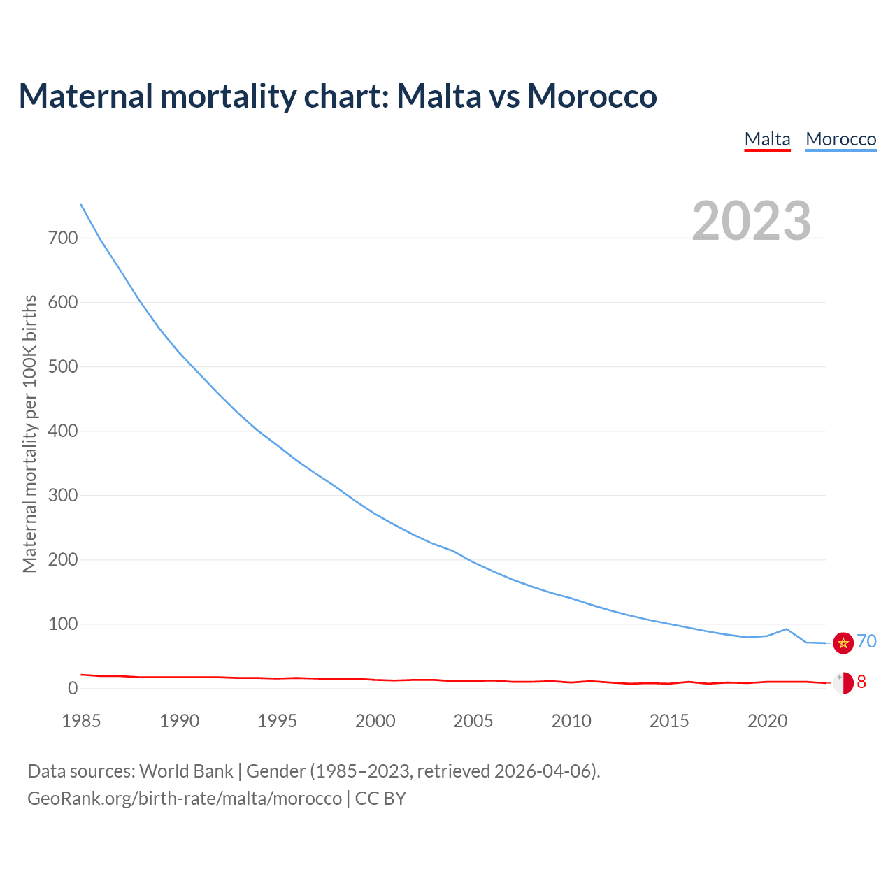 The maternal mortality rate, which is the probability of dying during childbirth or within 42 days of pregnancy termination, is 8 deaths per 100,000 live births in Malta, compared to 70 deaths in Morocco.